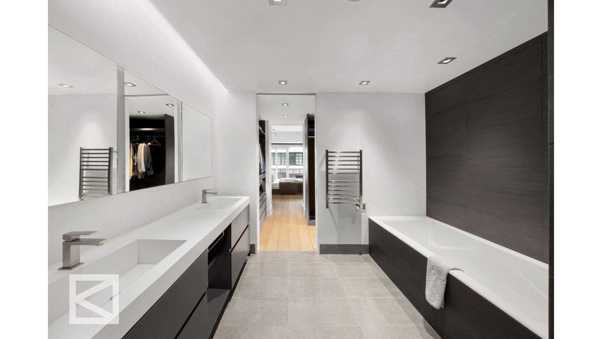 Accessed via a direct private elevator, the home has been renovated to the most exacting standards, where industrial character meets refined contemporary design. Extra-wide 7.5" Italian oak plank floors run throughout, complemented by solid wood doors with concealed hinges and magnetic closures. Floor-to-ceiling windows frame uninterrupted skyline and garden views, enhanced with discreet 3M UV-protection film that preserves light while ensuring interior comfort.