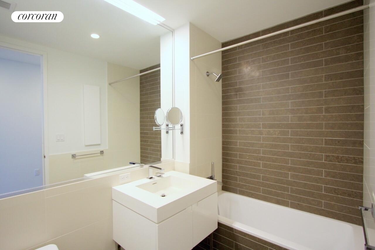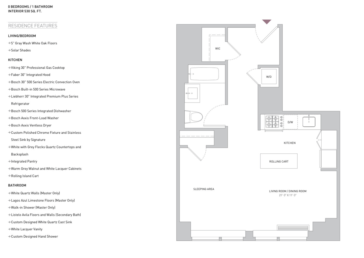 The home is in turnkey condition, featuring grey-wash white oak flooring and a sleek, modern aesthetic throughout. The chef's kitchen is seamlessly integrated into the living space, boasting quartz countertops, custom walnut cabinetry, and a premium appliance package that includes a Liebherr refrigerator, Viking gas cooktop, and Bosch microwave and dishwasher. The spa-inspired bathroom is equally impressive with glistening quartz walls, a deep soaking tub, and a custom vanity. Perhaps most importantly for city living, the unit includes its own Bosch washer/dryer.