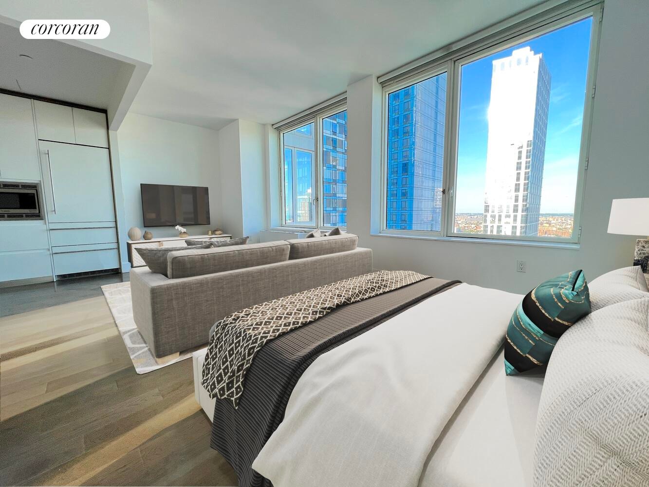 Ascend to the 38th floor of one of Brooklyn's most iconic towers. Apartment 38D is a sun-drenched, East facing sanctuary that perfectly balances high-design luxury with everyday functionality. Spanning approximately 530 square feet, this spacious alcove studio offers an airy, open layout that feels significantly larger thanks to soaring ceilings and a wall of oversized windows framing breathtaking sunrises and open Brooklyn vistas. This lovely home also comes with great closets including a walk-in closet.