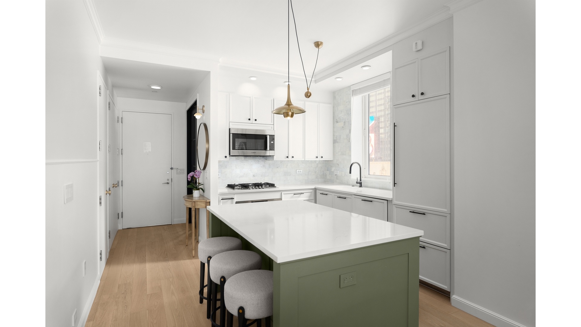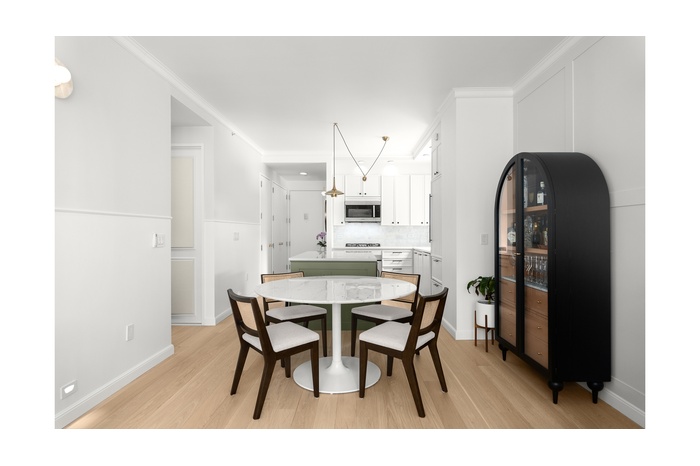 Located in the heart of Times Square, this beautifully renovated one-bedroom residence with a home office at 1600 Broadway on the Square seamlessly blends modern luxury with thoughtful design. The home features European white oak hardwood floors with acoustic insulation, elegant crown molding, custom wall paneling, and Lutron smart dimmer lighting that can be controlled directly from your phone. Remote-controlled electric blackout curtains, designer sconces from CB2 and Anthropologie, and custom closet lighting add both style and convenience throughout.