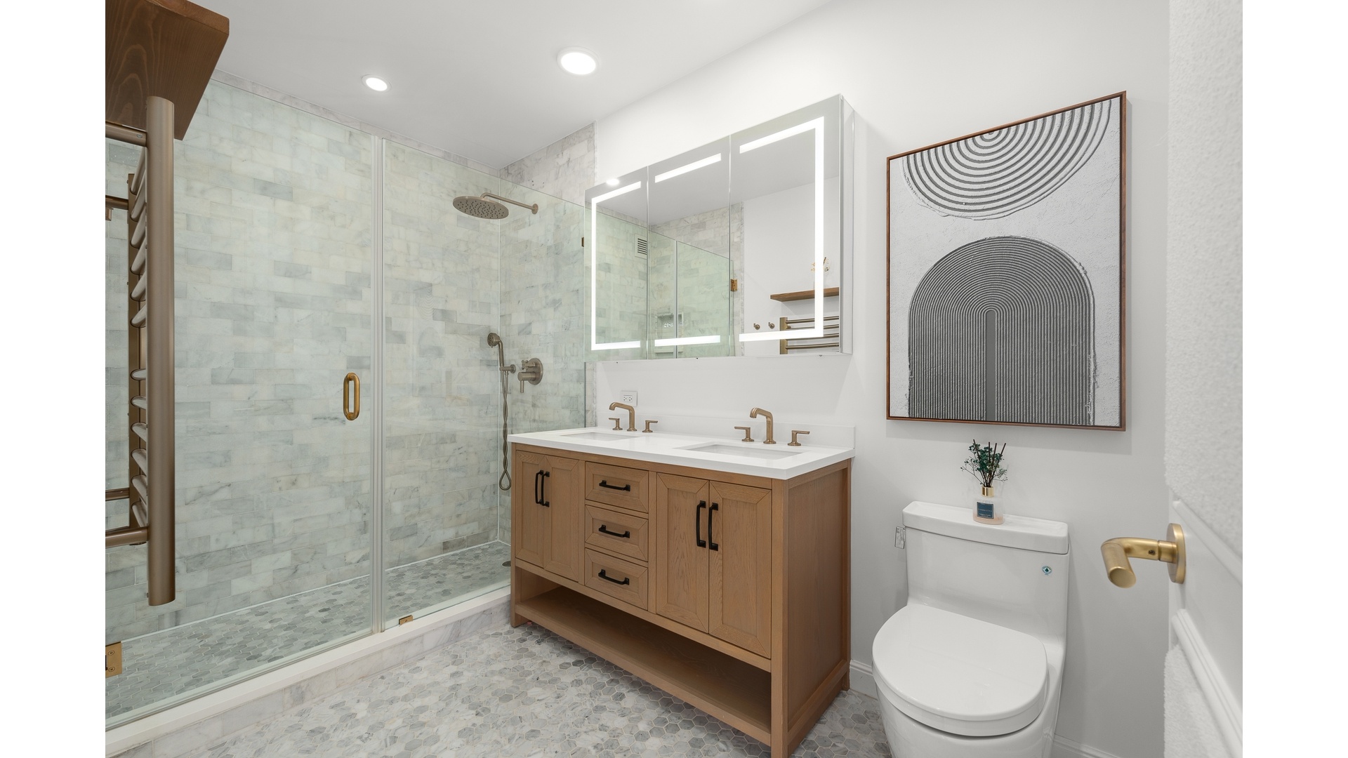 The chef's kitchen is outfitted with premium Bosch appliances, a Sub-Zero refrigerator, farmhouse sink, Rejuvenation hardware, soft-closing cabinetry, Carrara marble tile, and Santorini honed quartz countertops. A wine cooler and beverage can refrigerator complete the space, making it ideal for entertaining. The spa-inspired bathroom features Carrara marble floors and tiles, a double-sink vanity with Santorini honed quartz countertops, Rejuvenation hardware, a hardwired towel warmer, and an LED smart mirror with built-in defogger and touch controls.
