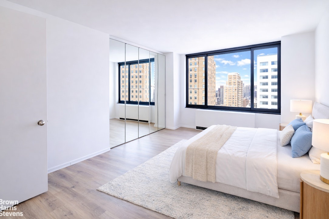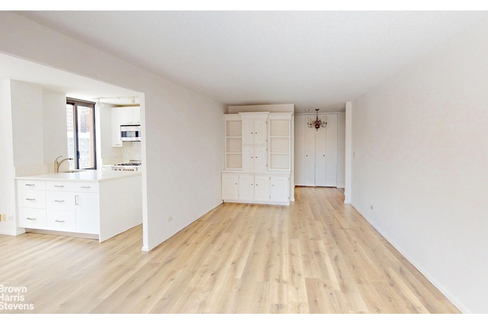 A gracious entry foyer with generous closet space creates a true sense of arrival, while the northeast-facing wall of windows pulls you into the expansive living and dining area that overlooks Rector Park and the World Trade Center. A separate dining alcove easily functions as formal dining, a sophisticated home office, or guest space. New easy-care plank flooring, and custom built-ins throughout, add both polish and practicality. The new, sleek open white kitchen is designed for entertaining, including a large quartz peninsula with storage on both the kitchen and dining sides, as well as stainless-steel appliances boasting a Bertazzoni range and Bosch dishwasher. The king-size bedroom features east-acing views, a wall of closets, a sitting area, and an updated luxurious en-suite bathroom with a walk-in shower.