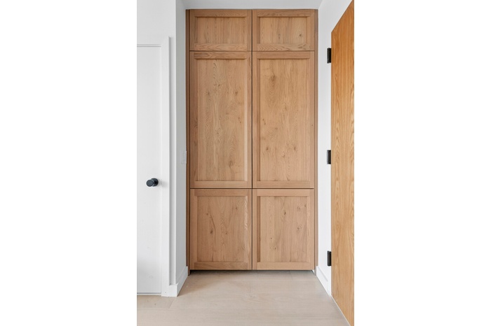 On entry, custom cabinetry lines the right side of the foyer, offering practical storage. The home opens into a generous living and dining area, anchored by a modern chef's kitchen with a clean layout. Custom Italian Stosa Cucine cabinetry is paired with Calacatta quartz countertops and a full suite of integrated Fisher & Paykel appliances, complemented by a Bertazzoni Professional Series gas range-both functional and visually striking.