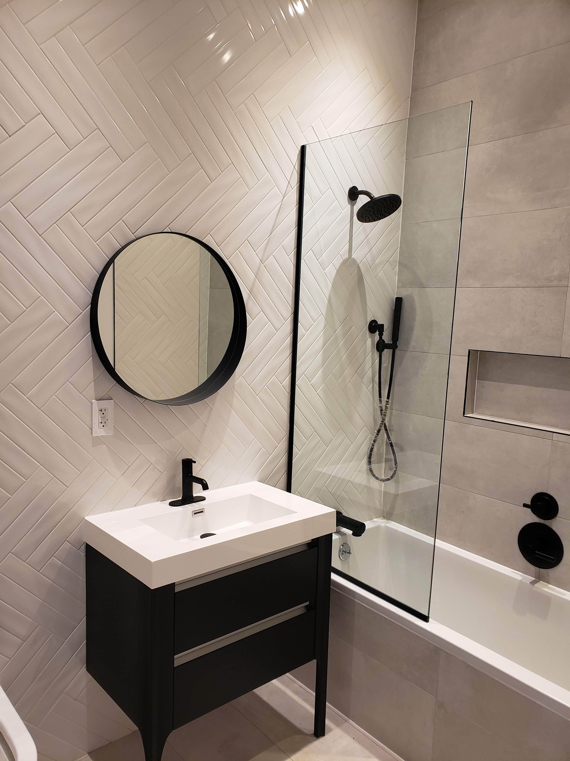 The oversized bathroom boasts monochromatic modern finishes, a deep soaking tub, and radiant heated flooring for ultimate comfort and luxury.