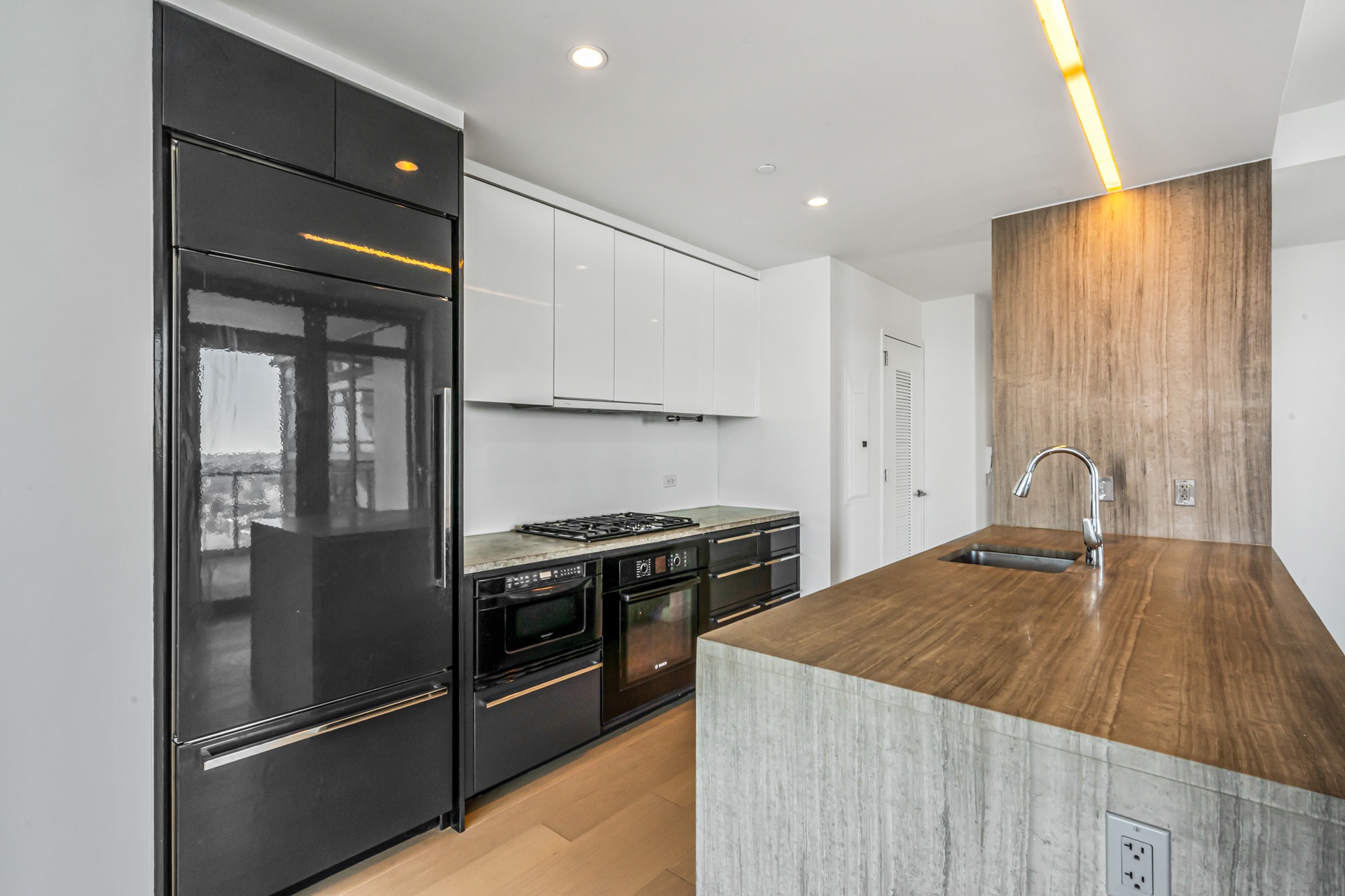 Experience the pinnacle of waterfront living in this high-floor, south and east-facing sanctuary at 2 Northside Piers. This rarely available split 2-bedroom, 2-bathroom residence perfectly balances modern luxury with the warmth of a true home, now featuring brand-new white oak floors that enhance the natural light flooding through every room.
