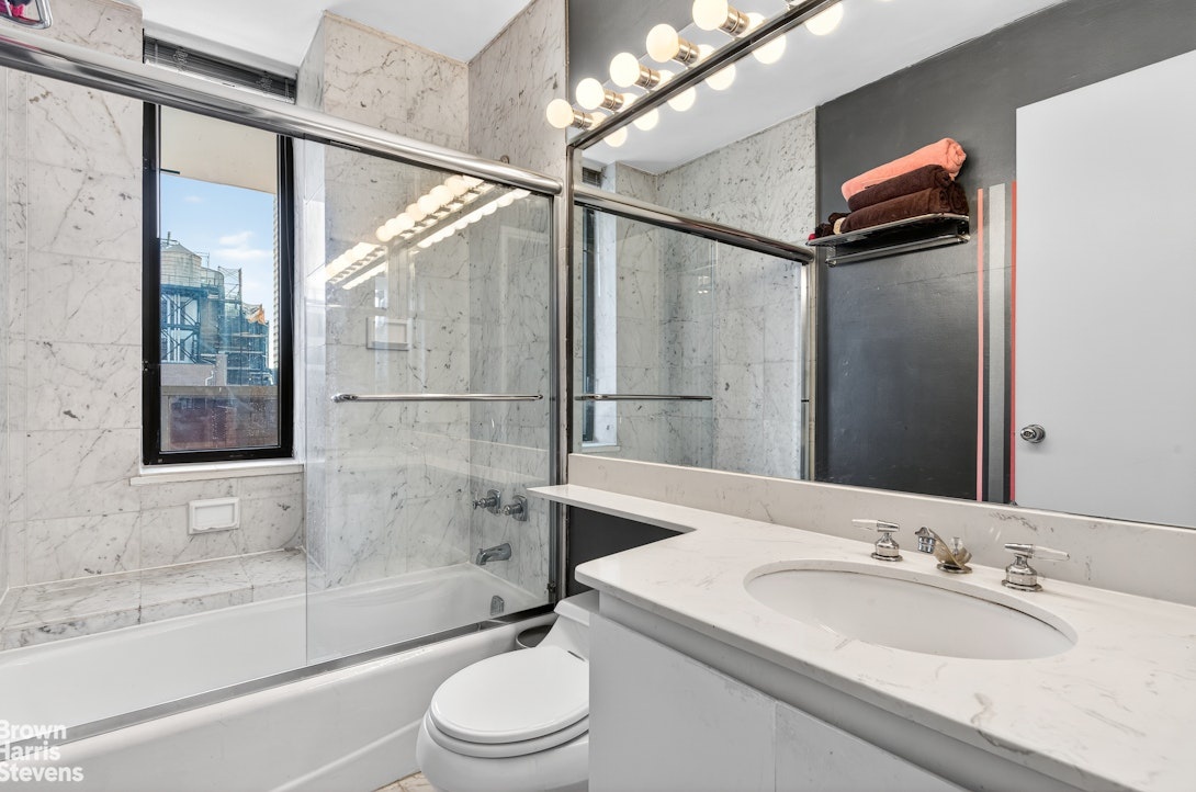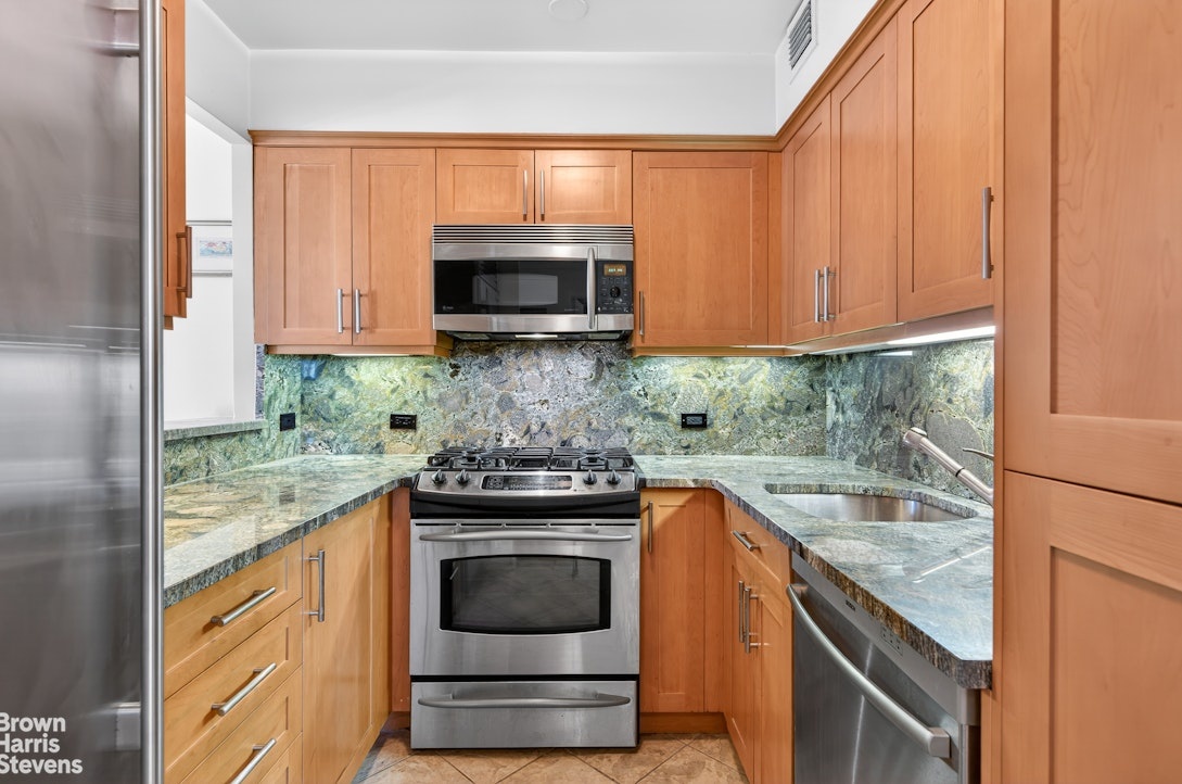 Be the first to see this fabulous 1 bedroom, 1.5 bath corner condo oasis with a private Southeastern wrap-around terrace offering open city and sliver East River Views! A much sought-after powder room is conveniently positioned just off of the entry. The light-filled expansive living/dining room has custom built-ins with a handcrafted bar, oversized windows and direct access to the terrace. The sizeable terrace expands 42 feet by 15 feet, a rare find perfect for outdoor dining and entertaining and especially for watching the fireworks on 7/4th! The sun-drenched bedroom has two exposures, an enormous built in closet, terrace access and a windowed en-suite marble bath. Enjoy the well-appointed renovated open kitchen with high end stainless steel appliances, granite counter tops and backsplash, custom cabinets, and a pass-through to the living area with a breakfast bar. Also boasting generous closets and hardwood floors.