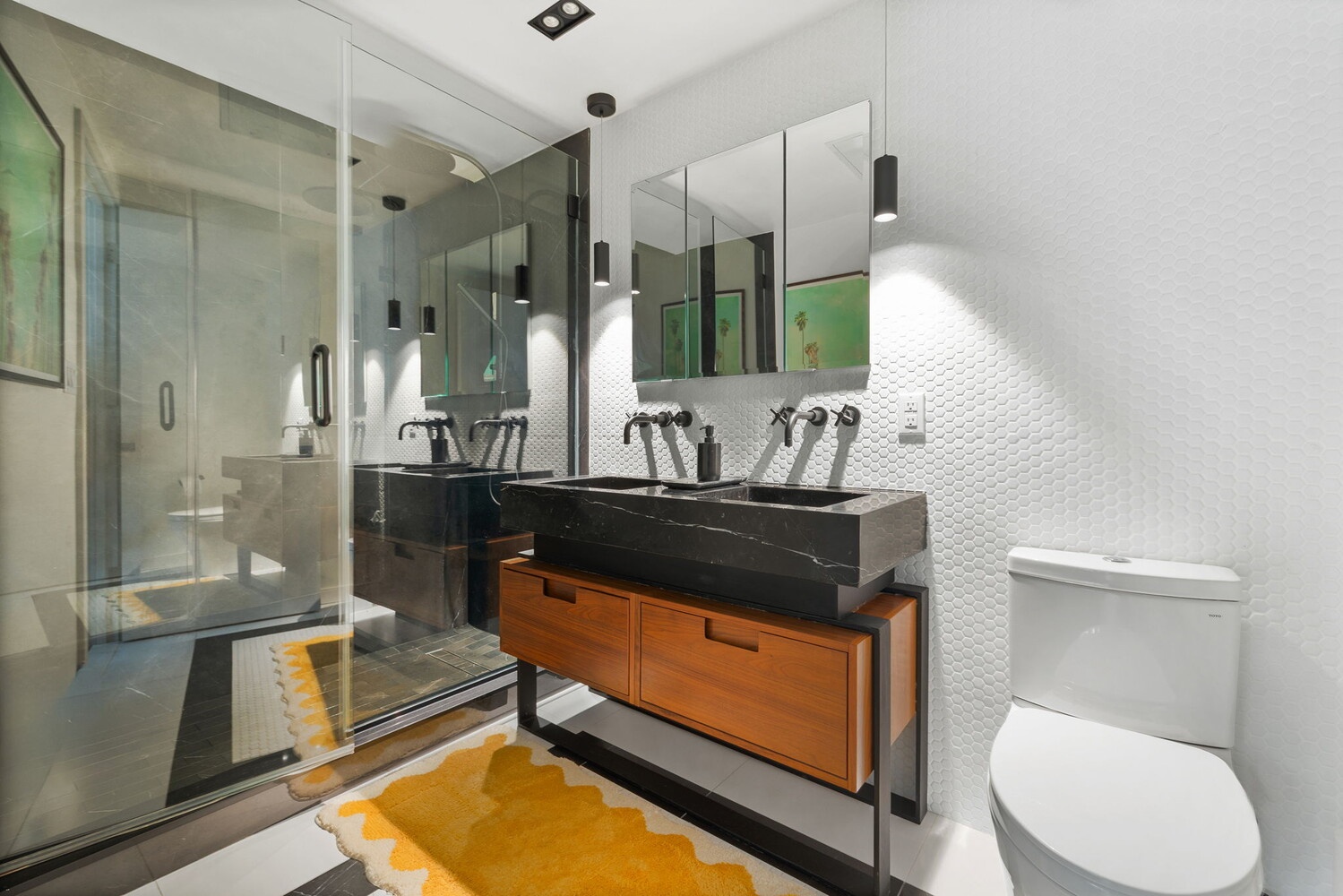 A keyed elevator opens directly into the home, creating privacy from the moment you arrive. The main living and dining area is expansive and light filled, anchored by a clean, modern kitchen that opens effortlessly to the living space. The expansive, deep kitchen showcases beautiful tilework from the floor inlay to the herringbone backsplash, all accented by under cabinet lighting. Chefs will appreciate the top tier appliances by Wolf, Bosch, and Fisher & Paykel, along with generous quartz countertops and a breakfast bar that overlooks the living room, ideal for both everyday living and entertaining. Floor to ceiling windows bring in abundant natural light and give the space a calm, polished feel.