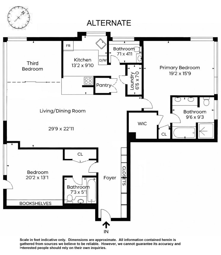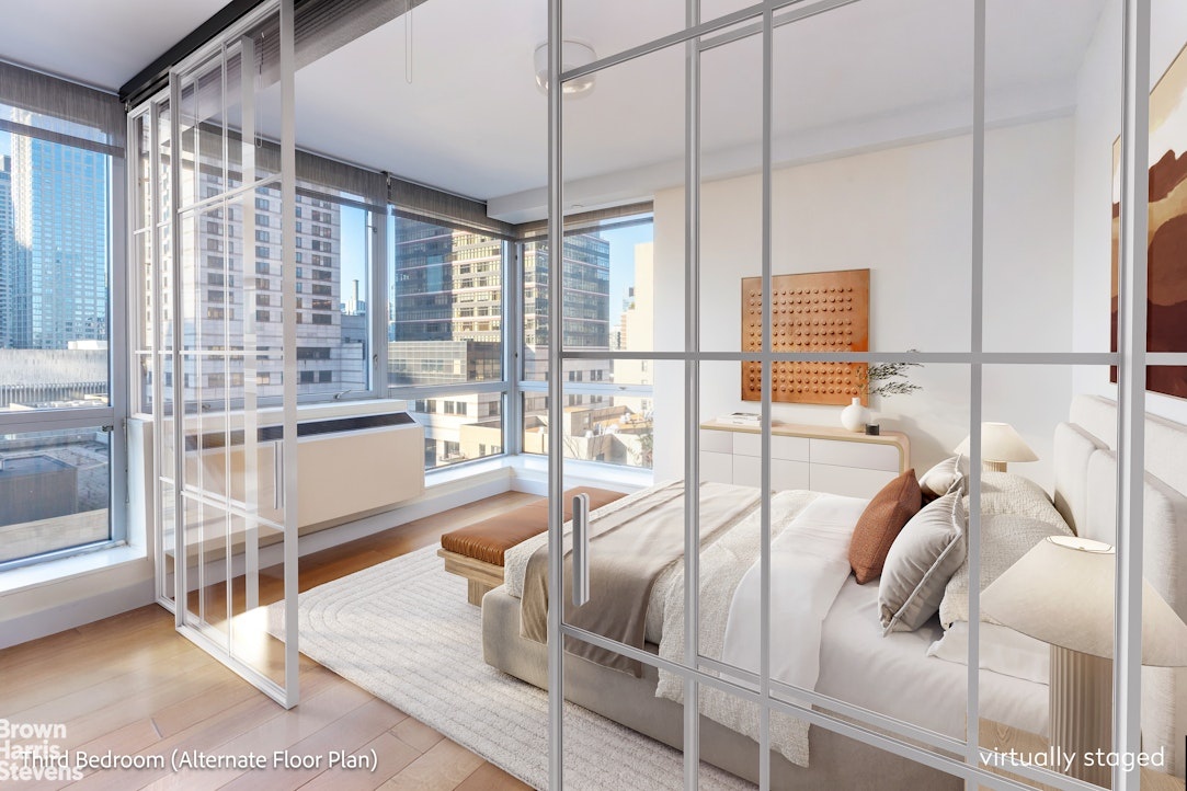 Located at Lincoln Center in a sought after premier full-service condominium, this split two bedroom apartment has been thoughtfully renovated and uses part of the dining / living space as a home office. This space can easily become a third bedroom with the addition of a wall. There are many possibilities for this wall as for example, the glass one featured with shades (see alternate third bedroom photo and alternate floor plan).