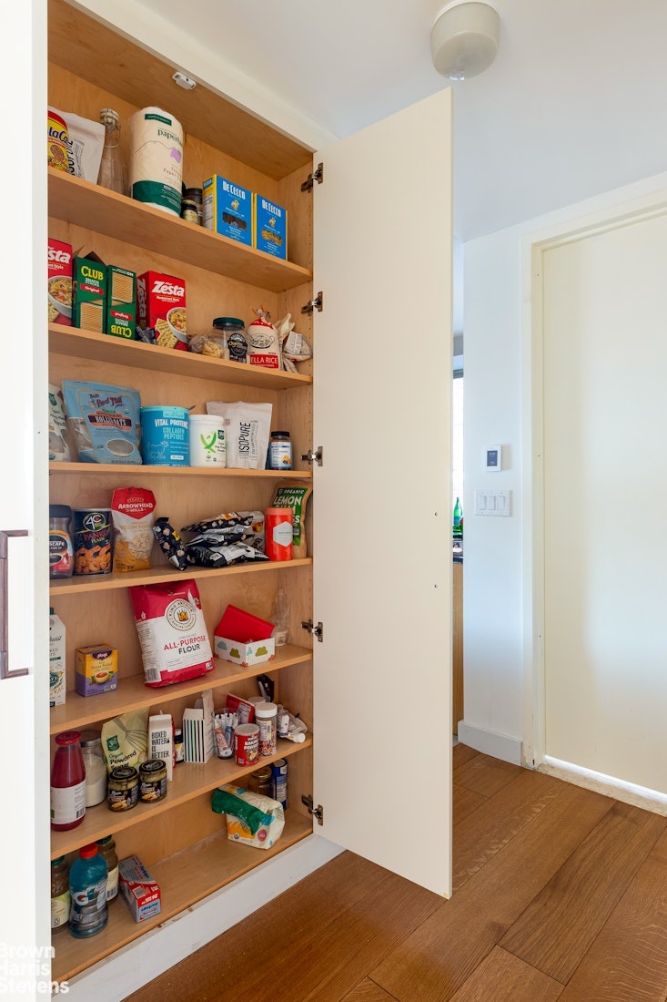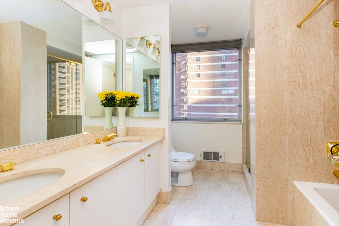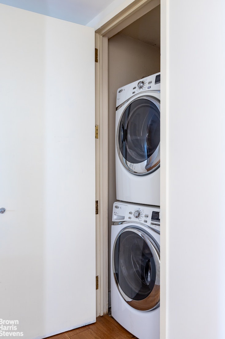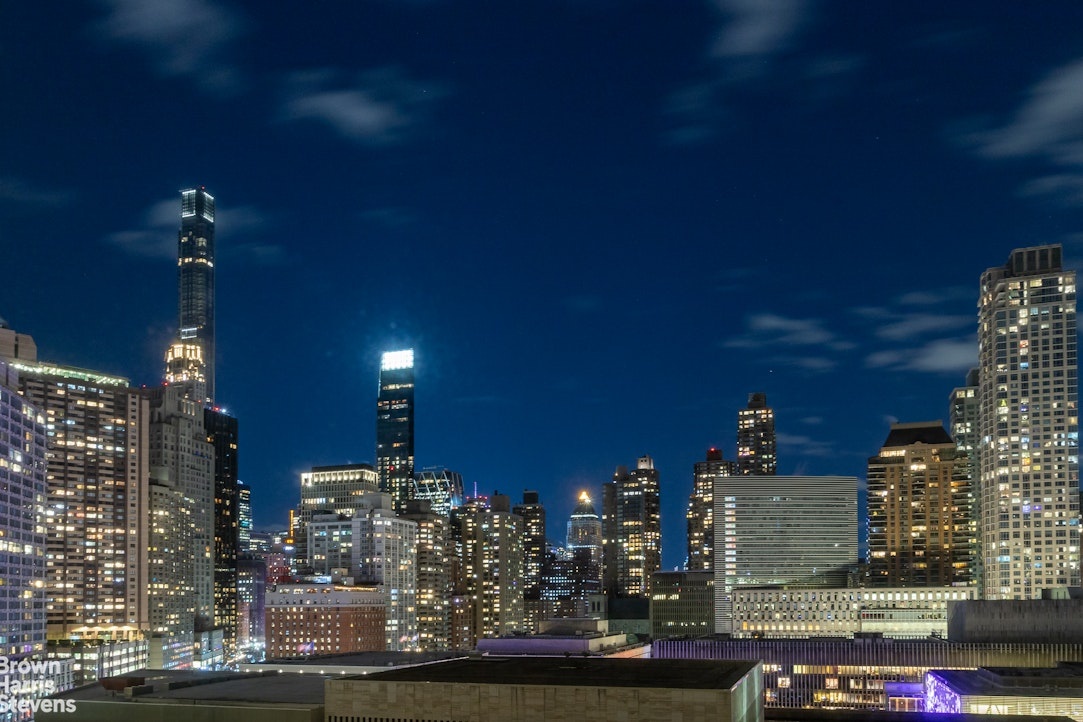 Sunlight floods through the windows of this spacious 1,577 square ft. home overlooking Lincoln Center, with views of the Manhattan skyline and multiple exposures. It has a meticulously designed partially closed off kitchen with made to measure cabinetry, underfloor heating, quartzite stone countertop and Viking stainless steel appliances including a dishwasher. The kitchen tiles for the backsplash and all are from Porcelanosa. With a stackable vented washer/dryer along with two full bathrooms and a powder room, this home offers the best of New York City living.