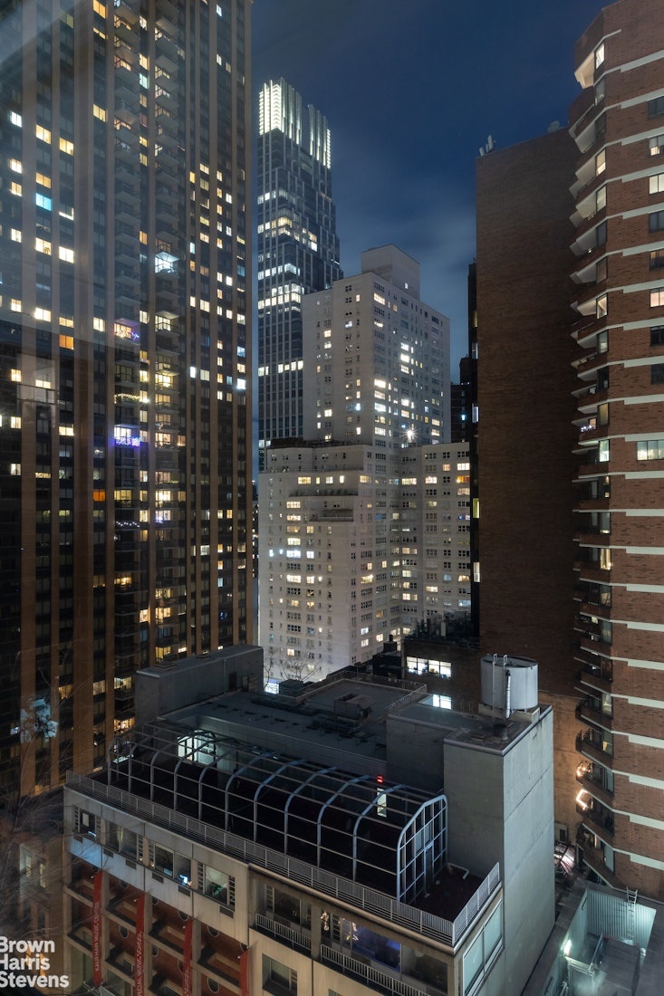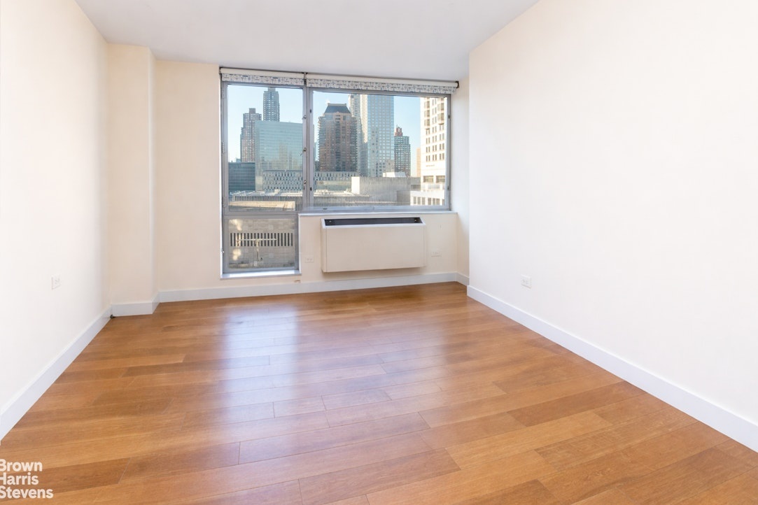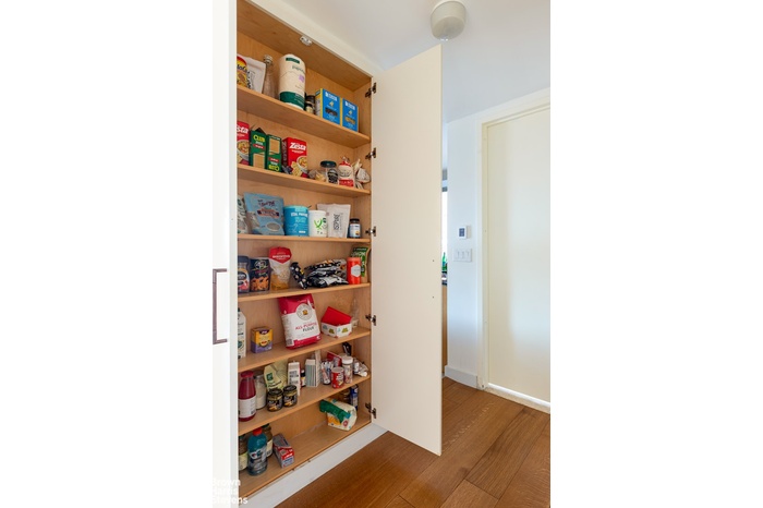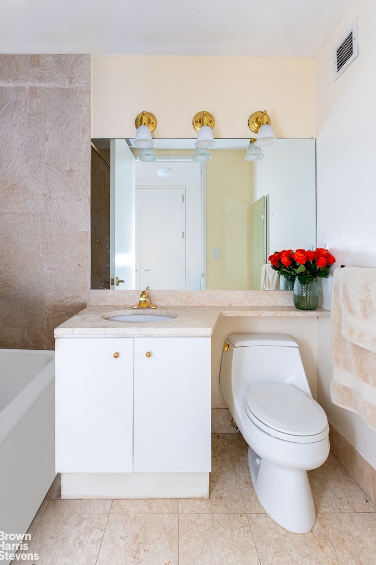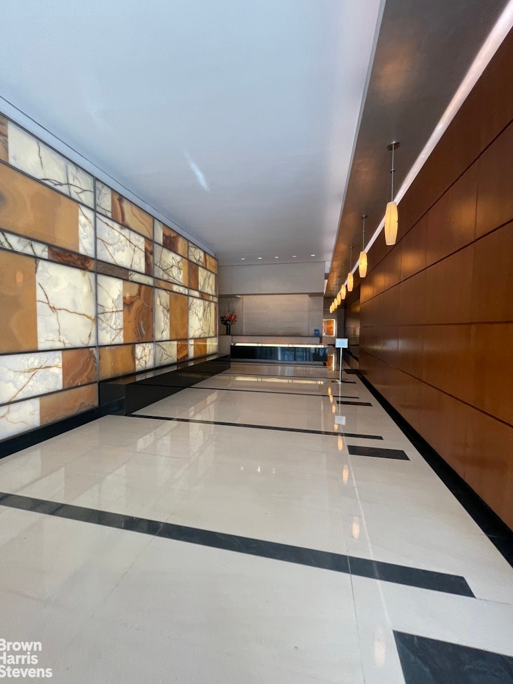 Sunlight floods through the windows of this spacious 1,577 square ft. home overlooking Lincoln Center, with views of the Manhattan skyline and multiple exposures. It has a meticulously designed partially closed off kitchen with made to measure cabinetry, underfloor heating, quartzite stone countertop and Viking stainless steel appliances including a dishwasher. The kitchen tiles for the backsplash and all are from Porcelanosa. With a stackable vented washer/dryer along with two full bathrooms and a powder room, this home offers the best of New York City living.