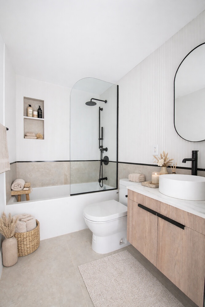 Oversized windows on both exposures flood the airy, well-proportioned layout with natural light, enhancing the residence's open feel. The generously sized bedrooms are thoughtfully separated from the residential area, offering flexibility for guests, a work-from-home office, or evolving needs. The two full bathrooms are finished with refined tilework and custom floating vanities, delivering a calm, spa-inspired experience.