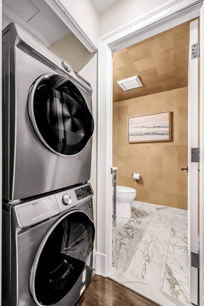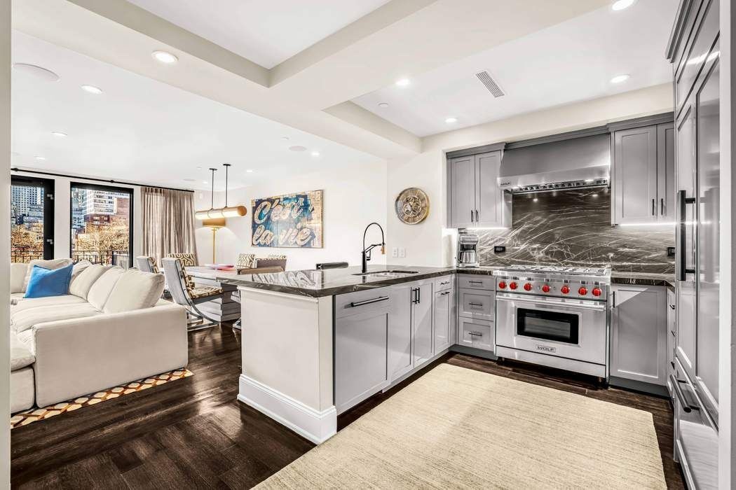 What truly sets this penthouse apart is its extraordinary outdoor offering. A full-floor private rooftop terrace serves as an extension of the living space, complete with a gas fireplace and outdoor kitchen—perfect for entertaining, relaxing, or enjoying open sky views in every season. An additional balcony off the living and dining area provides yet another outdoor retreat and a seamless indoor-outdoor connection.