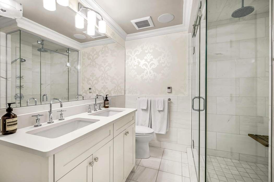 The primary suite is a true retreat, featuring a luxurious marble bathroom with double sinks, a large walk-in shower, and a separate soaking tub. The closet space is exceptionally well-appointed and beautifully designed, creating a dressing room that elegantly leads into the primary bath. The second bedroom is well-scaled, and an additional home office or guest room offers excellent flexibility.