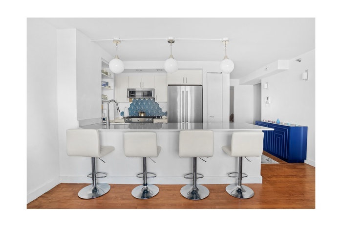 This sophisticated 2-bedroom 2-bath condominium has a well thought out interior that is bright and elegant. Walnut-stained hardwood floors greet you at the entry hall and lead you to a renovated open chef's kitchen that is nicely appointed with Ultra-Dekton clean surface island countertops, white high gloss cabinets, globe lighting, KitchenAid stainless steel appliances, a washer/dryer, and a garbage disposal. Capital Assessment of $181.85 per month until Dec 2026. Two months common charges paid by buyer. Pet Friendly.
