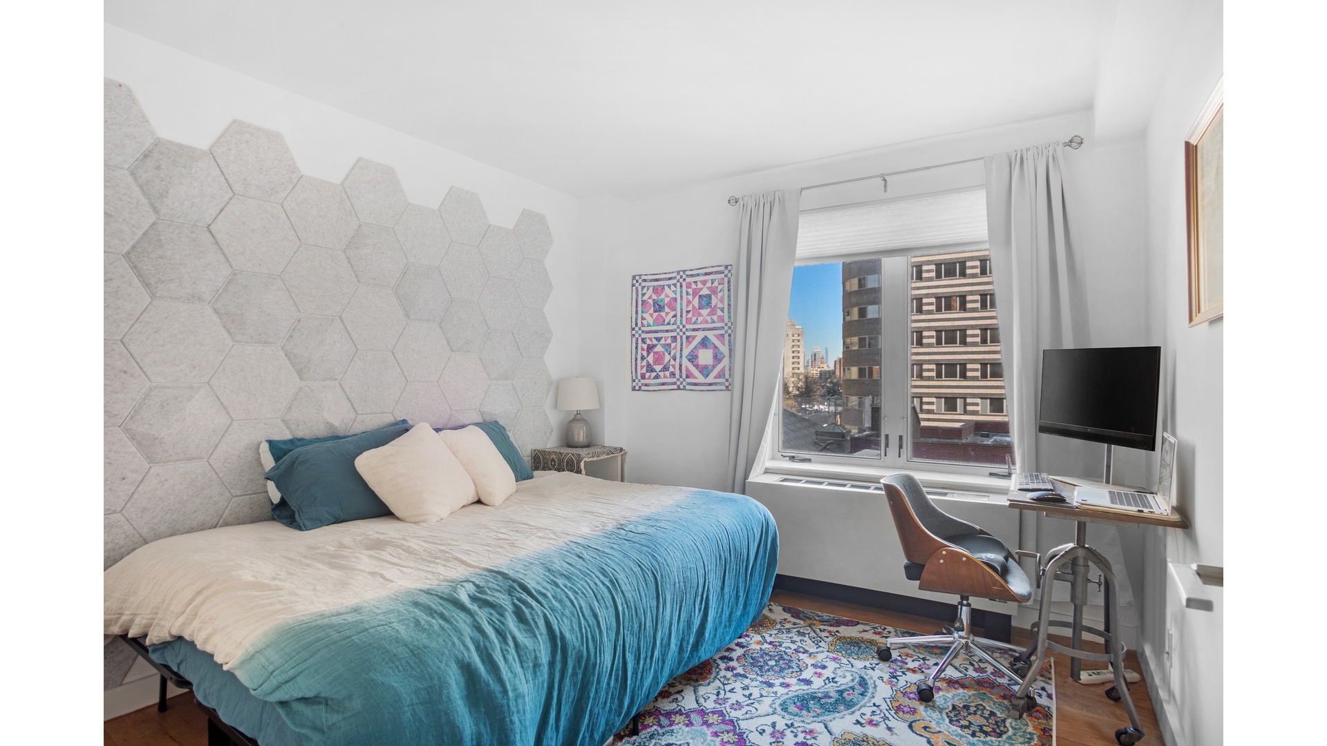 A gracious layout featuring a large living room basking in bright natural light overlooking landmarked roof tops. Nicely proportioned winged bedrooms along with two spa-like baths with radiant heated tiled floors, modern vanities, and custom built-in closet systems throughout this home. Large casement windows with multiple exposures north and south fill the home with natural light throughout the day. This home is also wired for FiOS.