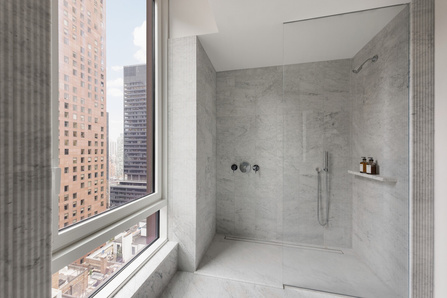Discover a blend of opulence and practicality in the bathroom design, where custom dark bronze vanities pair with pristine white Carrara tops and magnifying mirrors to add a touch of sophistication. Relish the warmth of underfloor heating (primary and perimeter bathrooms only) and the seclusion of tall reeded glass shower dividers. The contemporary charm is completed by wall-mounted Kallista fixtures and full-height fluted Bianco Carrara marble walls, with matching honed Bianco Carrara marble floors and bronze shelving that merge convenience with chic style.