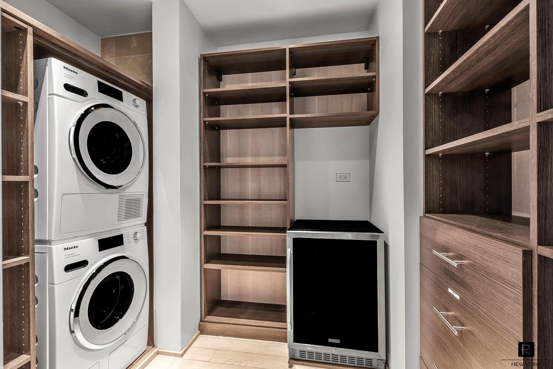 The master bedroom features LED lighting, three large fitted closets and an en-suite spa-like bath. The master bathroom includes a double sink vanity, frameless glass shower, separate Neptune Zen soaking tub, honed-finish travertine with teakwood marble and Toto bidet toilet. The second bedroom features amazing storage space with a fitted walk-in closet. This bedroom also includes an en-suite travertine marble bathroom featuring deep soaking tub and Toto bidet toilet. There is an additional well proportioned third bedroom with en-suite marble bathroom as well. Additional features include newly refinished white oak flooring, LED lighting throughout the living room, custom millwork, multi-zone Nest thermostat controls and motorized blinds through-out. No home would be complete without its own laundry room with wine refrigerator and Miele washer and dryer. Residents of this LEED Gold rated Green Building enjoy apartments with fresh filtered air and water and lower energy bills.