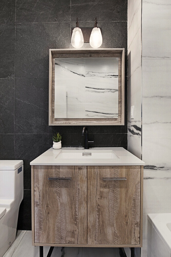 The residence features wide-plank white oak flooring throughout, floor-to-ceiling black framed aluminum windows, an open kitchen featuring a hand-hammered copper farm house sink with quartz countertops, accented with a weathered porcelain subway backsplash. The appliance package consists of a stainless steel Bosch refrigerator and dishwasher as well as a Bertazzoni gas range. The bathroom is designed with a blend of elegant marble-patterned tiles and oversized matte black tiles, completed with matte black hardware for a refined finish. All residences are equipped with Fujitsu ductless mini-split Systems for quiet, energy-efficient heating and cooling, and W/D.