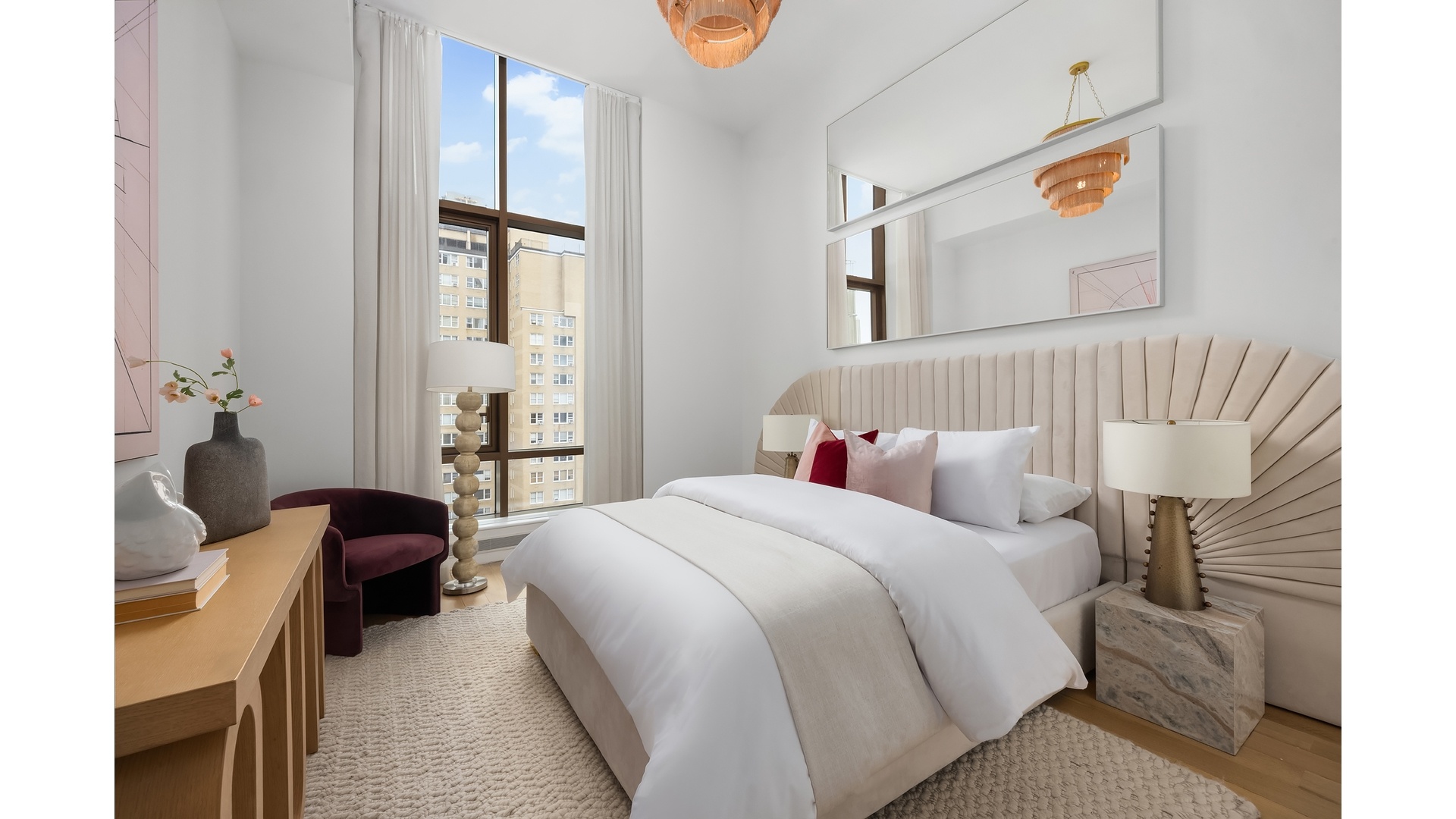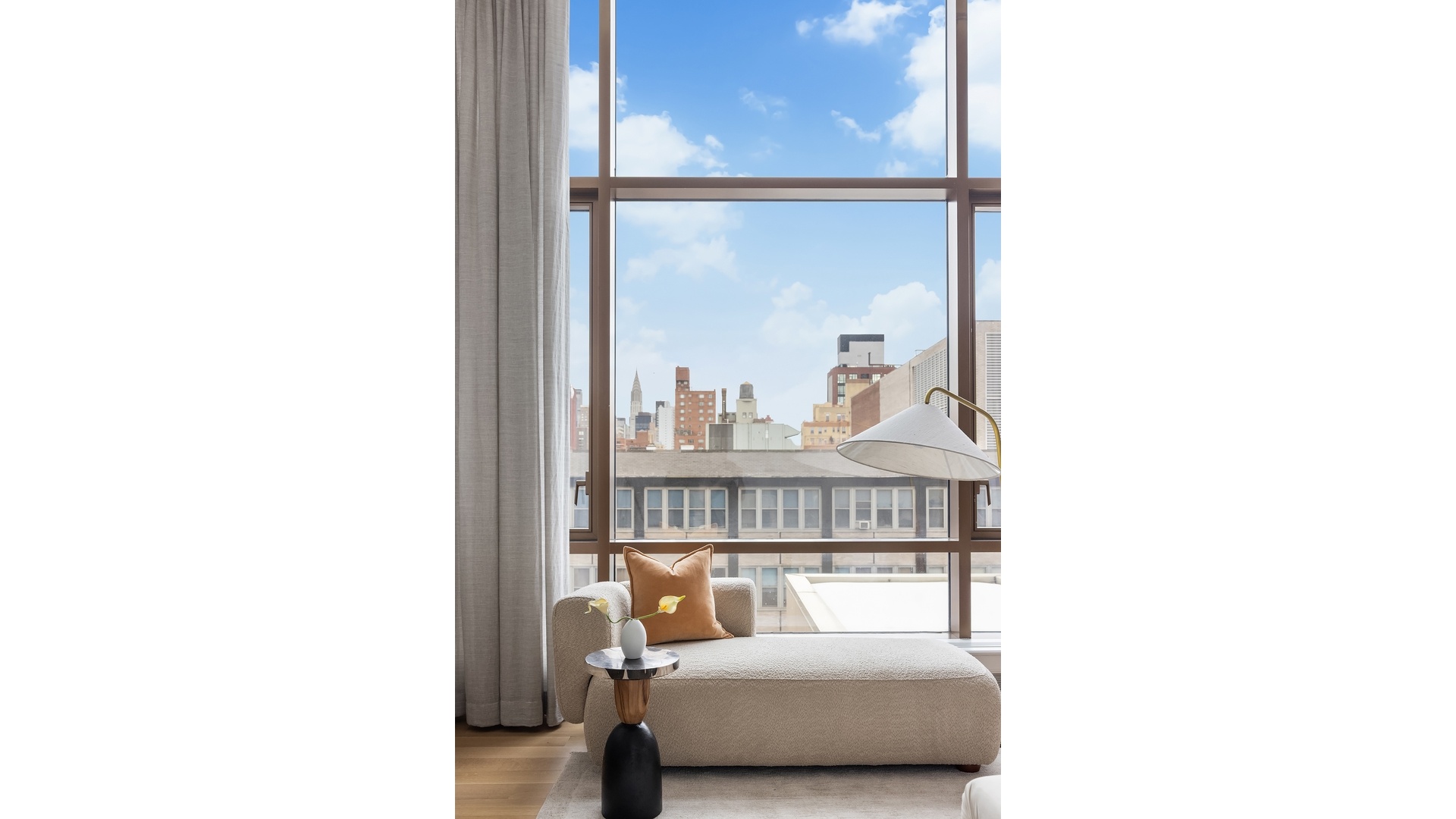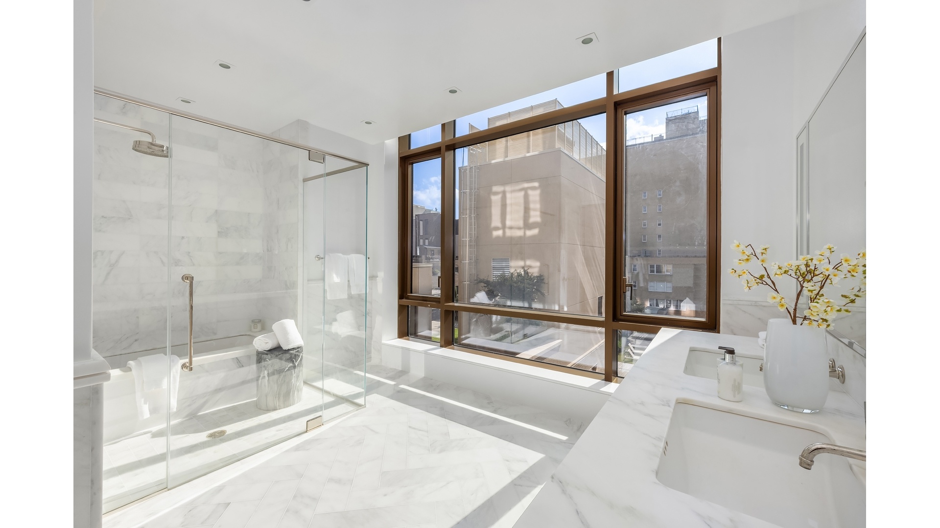 Retreat to the serene corner primary suite, which features city views that stretch from the East River to the Empire State Building. The ensuite primary bath is a sanctuary with a deep Kohler soaking tub, expanded glass-enclosed rain shower, radiant heated flooring, double vanity, and Lefroy Brooks fixtures-all illuminated by curated lighting and set against a timeless marble backdrop.