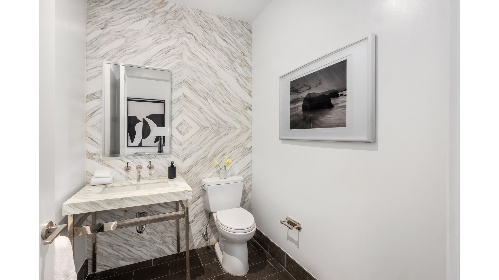 Two additional east-facing bedrooms each offer ensuite marble bathrooms-one with a soaking tub and the other with a large walk-in shower. A beautifully appointed powder room, an enlarged utility closet with an LG washer and vented dryer, a folding station, and multi-zone central HVAC provide convenience and comfort.
