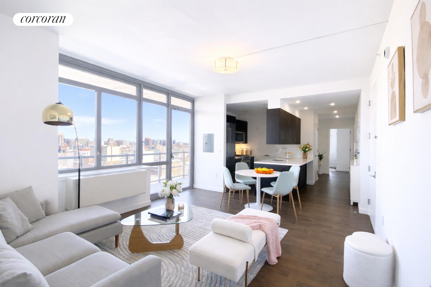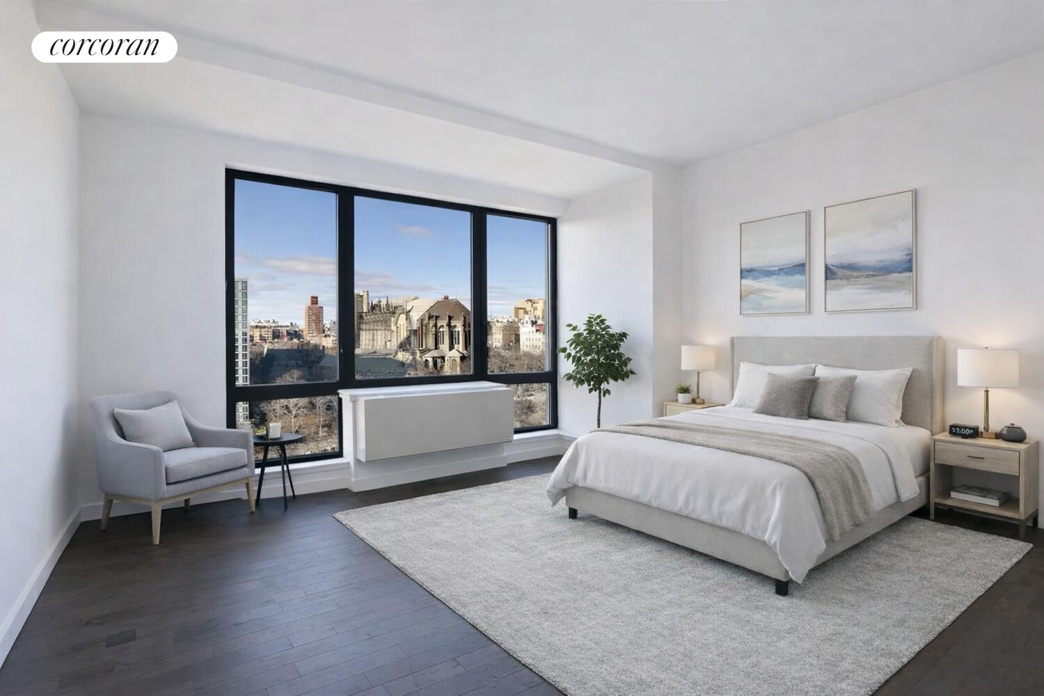 Perched high above Morningside Park and Central Park, this two bedroom, two bathroom home boasts a private 85sqft balcony with stunning open views of Morningside Park and The Cathedral of St. John The Divine. The open chef's kitchen features a breakfast bar, custom cabinetry, Luce Di Luna countertops, top of the line stainless steel appliances, and plenty of cabinet space. The split bedroom layout creates privacy and the most ideal two bedroom configuration. The primary bedroom boasts stunning, light filled views of Morningside Park and the Cathedral. The east-facing second bedroom windows overlook the north corner of Central Park, with views of the morning sunrise. From the private balcony in the living room, enjoy unobscured views of the city, including the Cathedral of St John and the George Washington Bridge. Other features include oak hardwood floors throughout, 9 foot ceilings, thru-wall HVACs in every room and an in unit washer/dryer with additional laundry capabilities in the building.