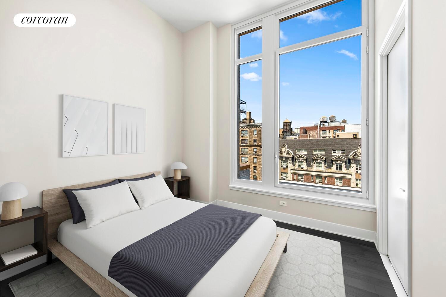 With soaring 12'8" ceilings and a gracious, well-balanced layout, the residence delivers a refined sense of scale and flow. The living and dining area is framed by oversized western-facing windows and opens directly onto the terrace, enhancing the connection between interior and exterior spaces.