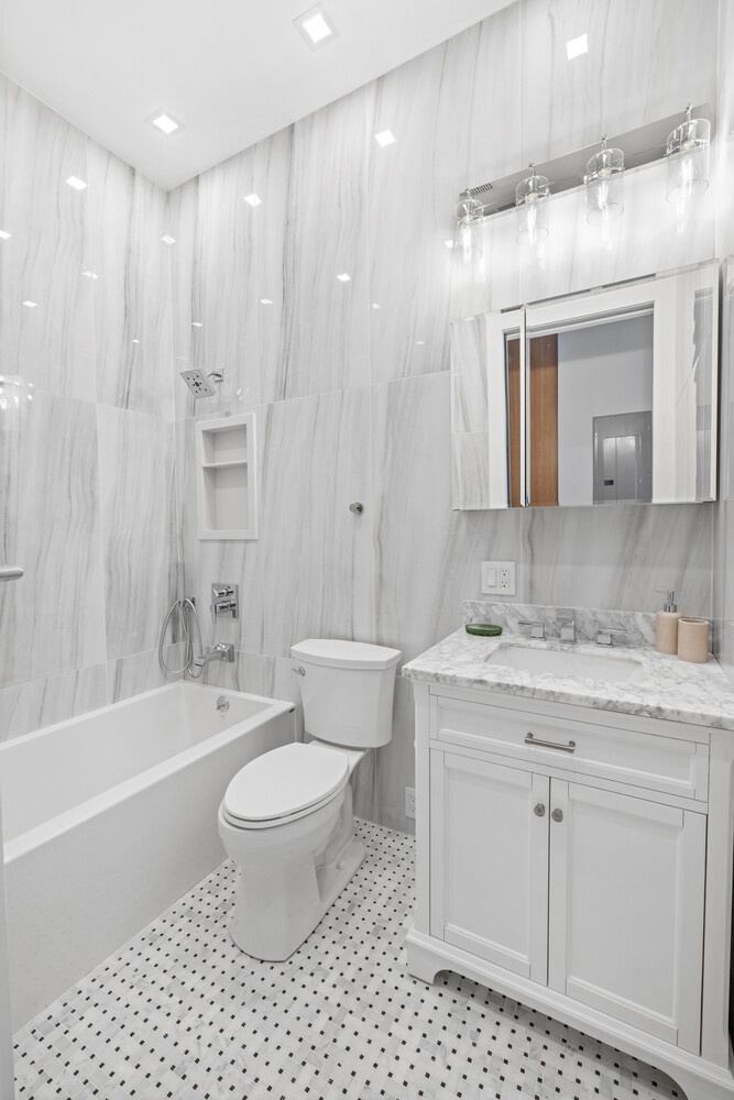 The two full baths are gloriously pristine, with their ivory color palette and marble touches. The vanities provide extra storage, while the oversized soaking tub is as luxurious as it is inviting. The walk-in shower in the primary bathroom includes an oversized rain bath showerhead.