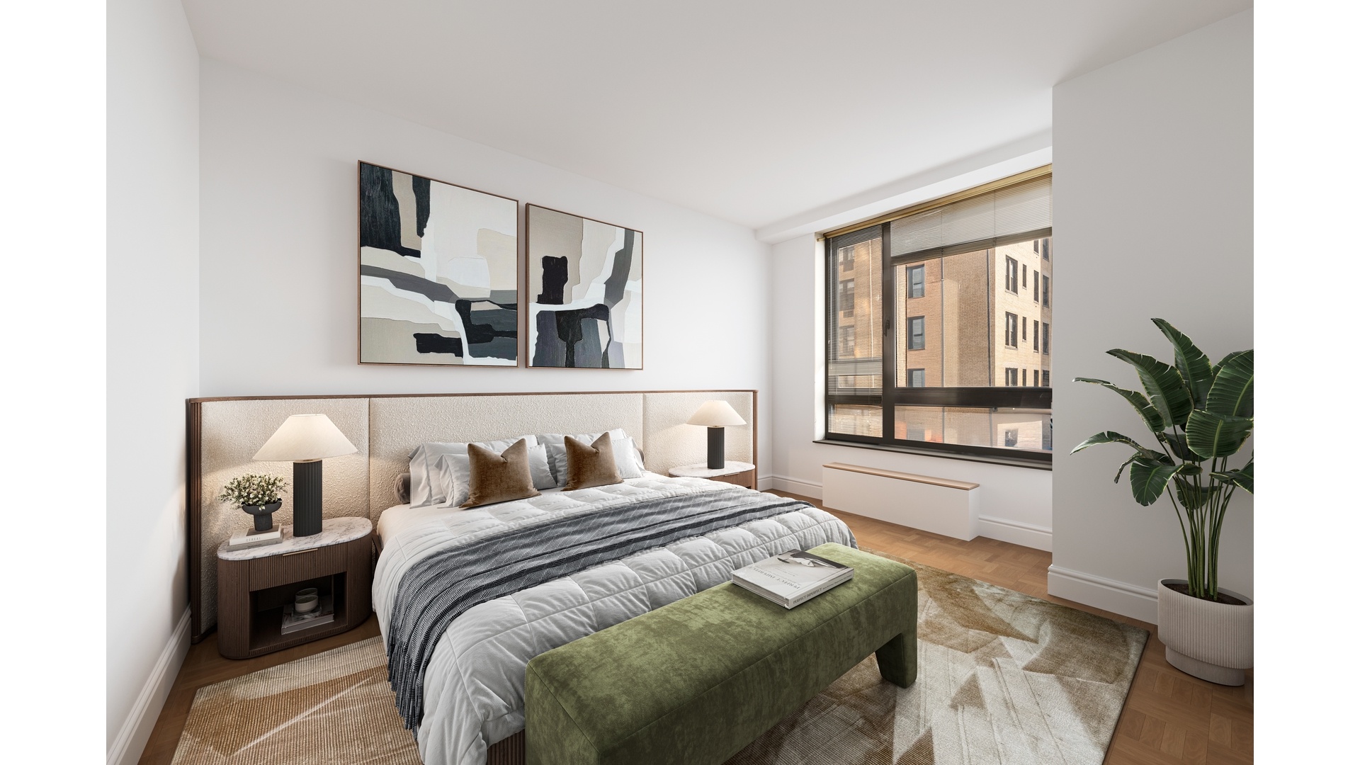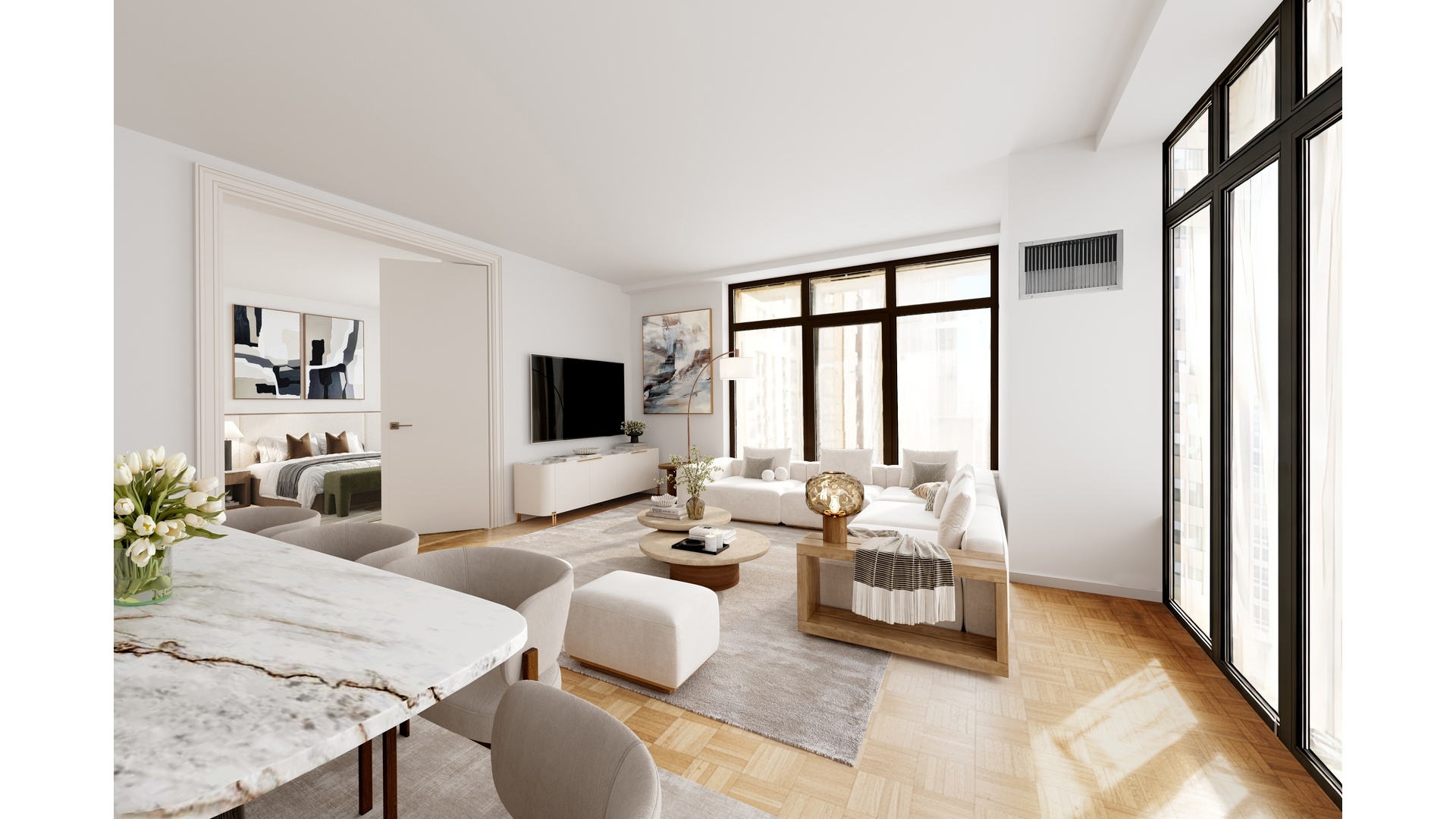 The kitchen is designed for both convenience and style, offering ample workspace and premium appliances often including top-tier brands such as Sub-Zero. Hardwood floors, refined stone details, and quality finishes throughout complement the home's gracious proportions and timeless elegance. The photos are virtually staged to showcase the apartment with a modern aesthetic.