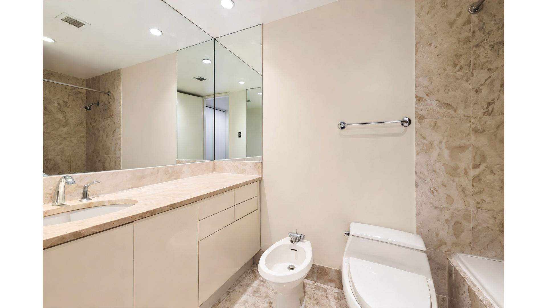 The thoughtfully designed layout features generous living and dining areas ideal for both everyday comfort and entertaining. A private bedroom wing includes a spacious primary suite with a marble en-suite bathroom and excellent closet space, while the additional bedrooms provide flexibility for family, guests, or a home office.
