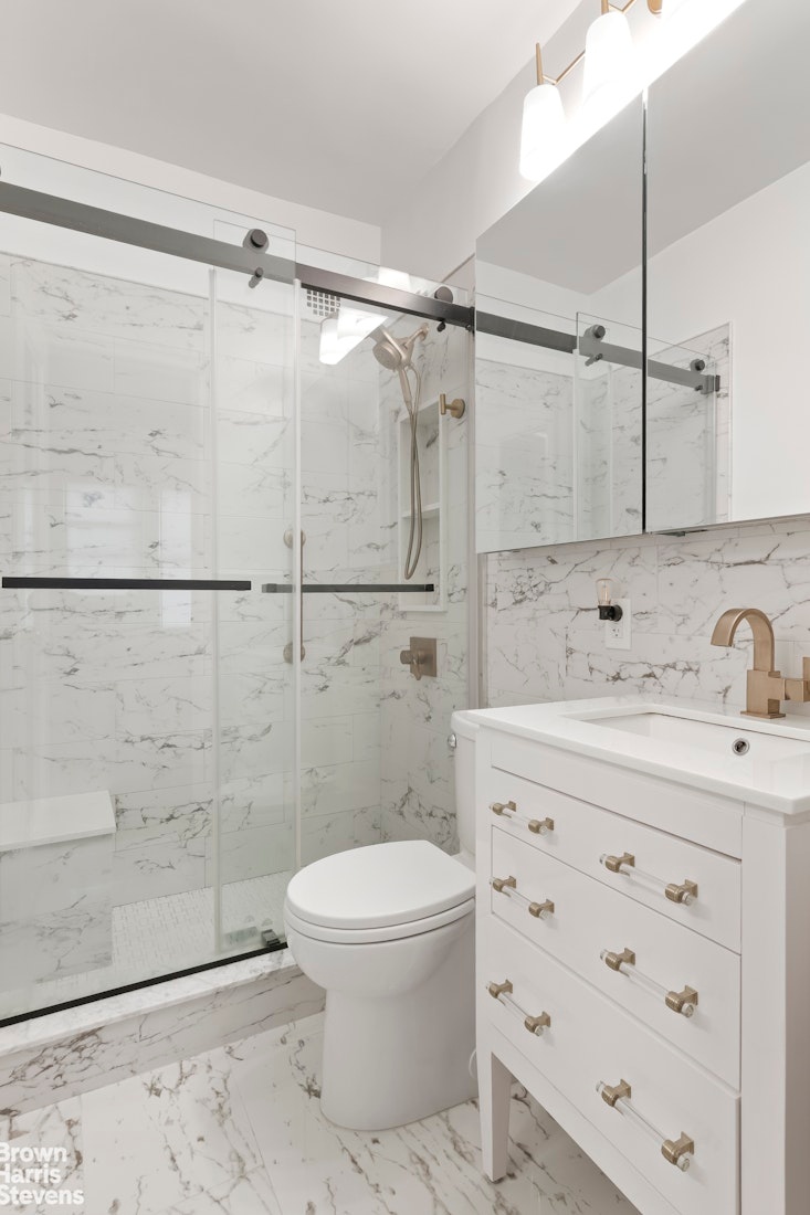 The renovated bathroom offers modern fixtures, a spacious vanity, and a sleek walk-in shower.