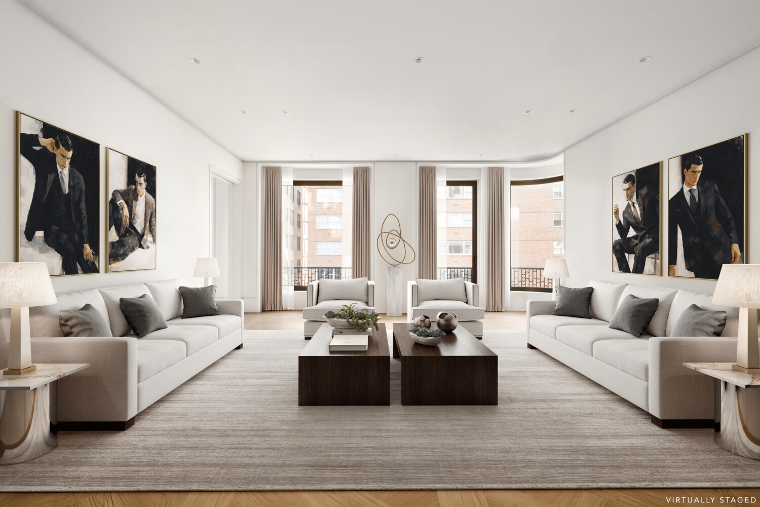 The dramatic 24'6" x 19'6" living room enjoys open Madison Avenue streetscape views, capturing the avenue's celebrated historic architecture through oversized 8-foot windows beneath soaring 10-foot ceilings. Custom Parquet de Versailles white oak flooring seamlessly blends timeless Upper East Side elegance with contemporary design.