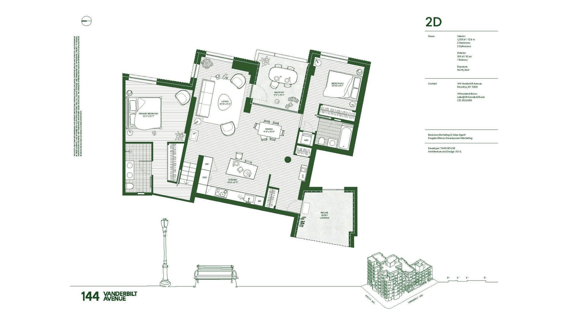 Introducing Residence 2D, a 1,305 SF, two-bed, two-bath split-level home with North and East exposures. The arrival experience begins outside of your front door, where a separate entry landing offers framed views of historic Vanderbilt Avenue. Upon entry, white oak floors, exposed concrete ceilings and natural lighting from oversized windows set the scene for contemporary, design-forward living.