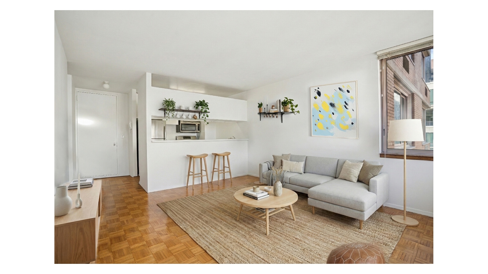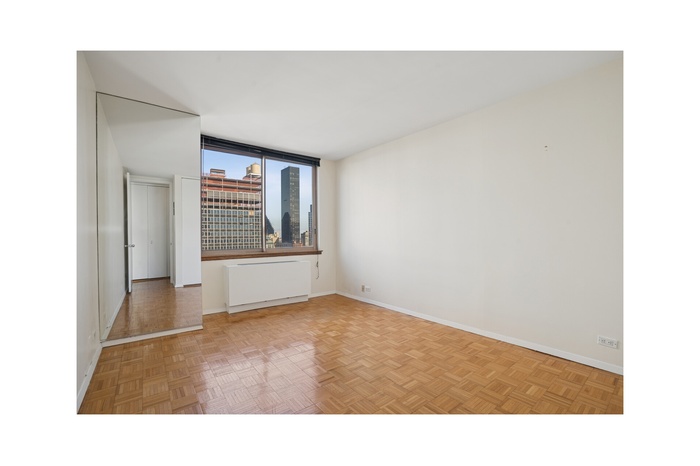 Spectacular Chrysler Views, One Vanderbilt and East River from your entire apt!!. Beautiful, SUNNY 1 bedroom in a Full-Service Condominium. Spacious Living room with oversized windows with exposure to North and West views. Large bedroom can hold a queen size bed, two night stands and dressers . Ample, deep closet space ( for all your luggage, bikes etc) , with custom shelving. Gorgeous, brand New Hardwood floors throughout the apt. Recently renovated bathroom with marble vanity sink. Pass through kitchen with plenty of closets for storage.