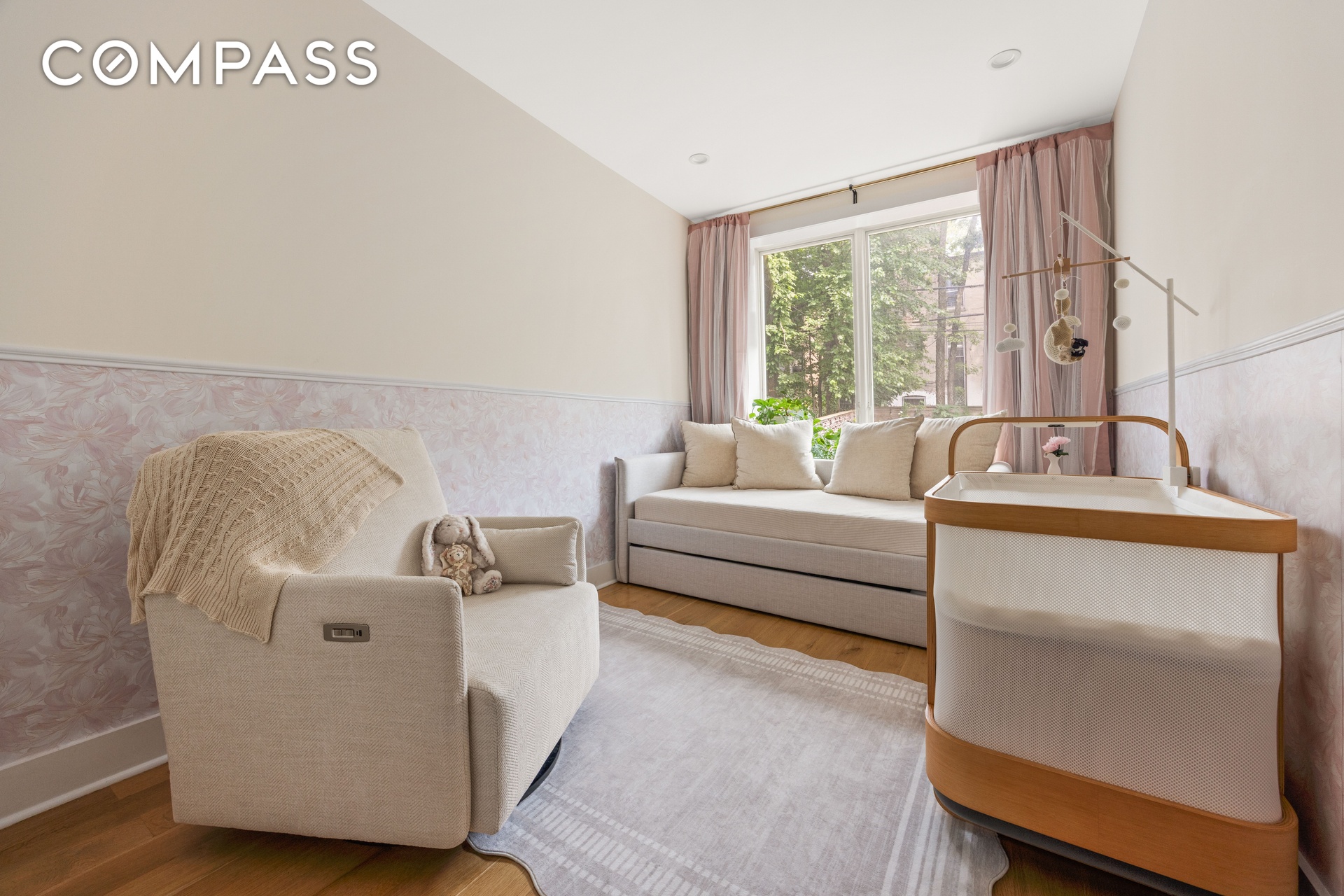 Upon entering, you are greeted by soaring ceilings, wide-plank oak floors, bathed in natural light. The dining area is framed by an elegant bay window overlooking tree-lined Bainbridge Street. Warm wood tones, soft neutral finishes, and thoughtful design elements create a serene, inviting atmosphere that flows seamlessly into the adjoining living space.