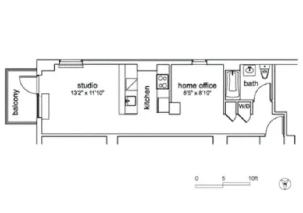 This well-laid-out studio offers approximately 525 square feet of interior space, including a separate windowed home office that can function as a junior one-bedroom.