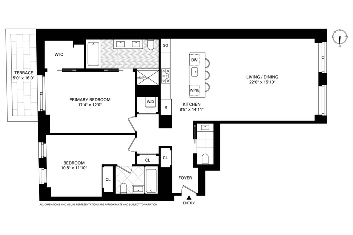 The spacious second bedroom features its own beautifully appointed en-suite bath with rich marble finishes and oak paneling, along with a large custom-built closet.