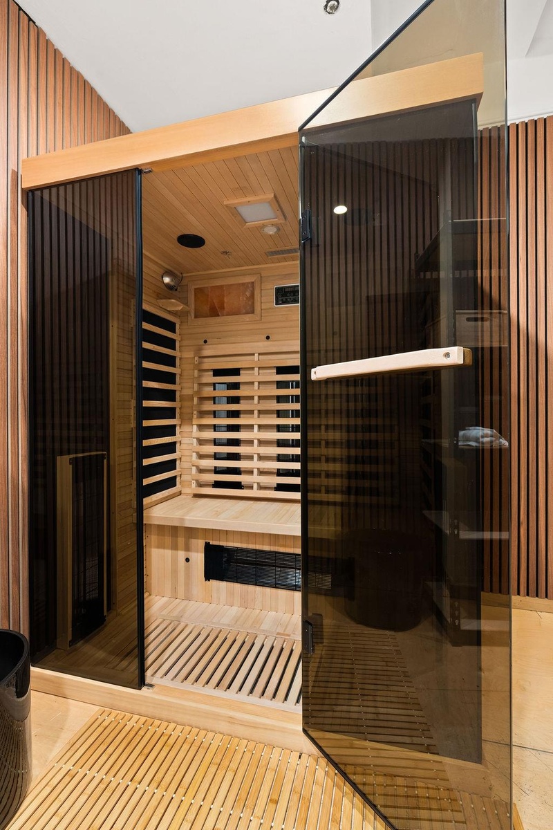 The open kitchen is outfitted with stainless steel appliances, including a brand-new refrigerator and dishwasher, plus a breakfast bar ideal for entertaining. Both bathrooms were fully remodeled within the last two years, and the home offers central heating and air conditioning, a video intercom system, and the rare luxury of a private infrared sauna—your own in-home wellness retreat.