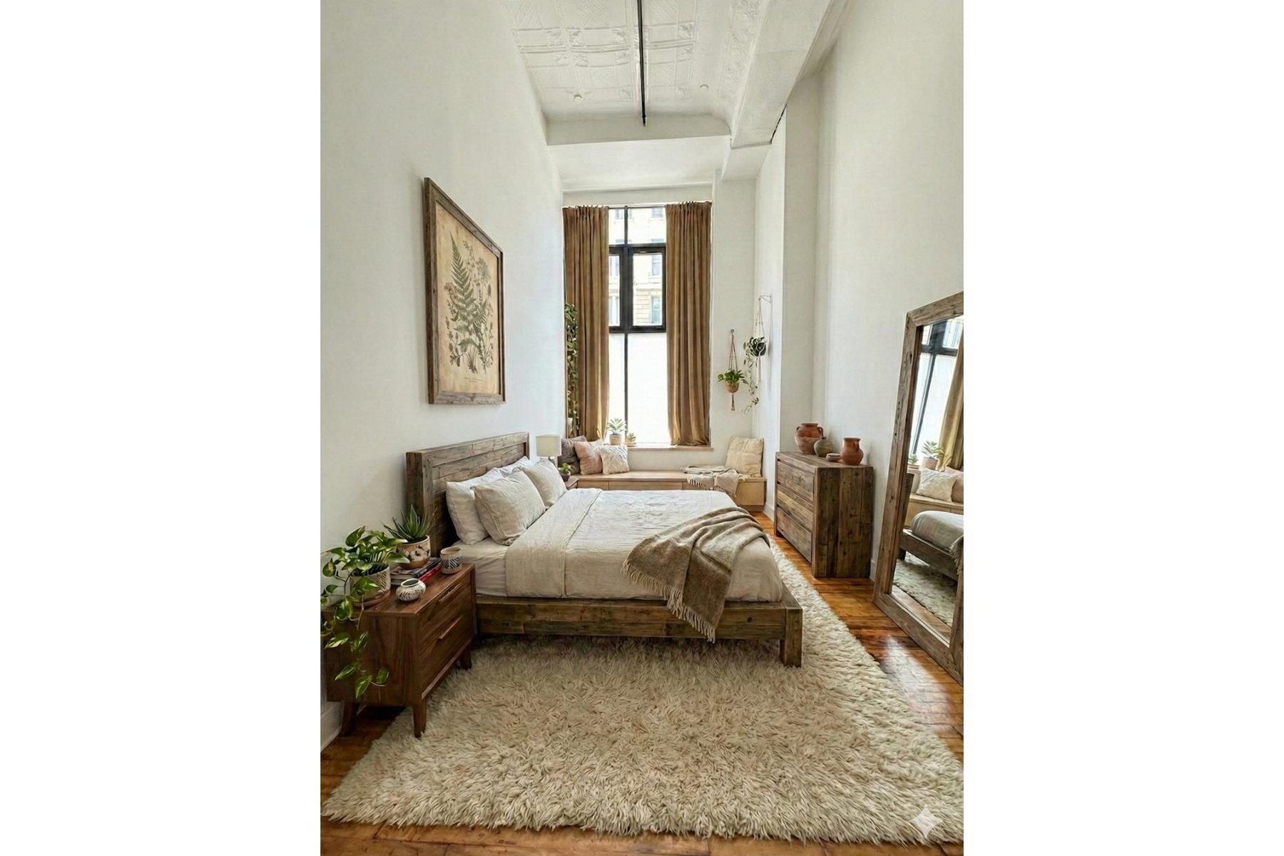 This dramatic triplex loft is flooded with natural light from four oversized west-facing windows and features soaring ceilings, original factory hardwood floors, cast-iron columns, and tin-plated ceilings that speak to the building’s industrial roots.