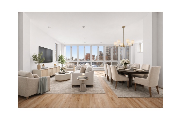 The expansive corner living room features two exposures, highlighted by a dramatic wall of East-facing floor-to-ceiling windows and an additional North-facing window offering breathtaking views of the iconic Chrysler Building.