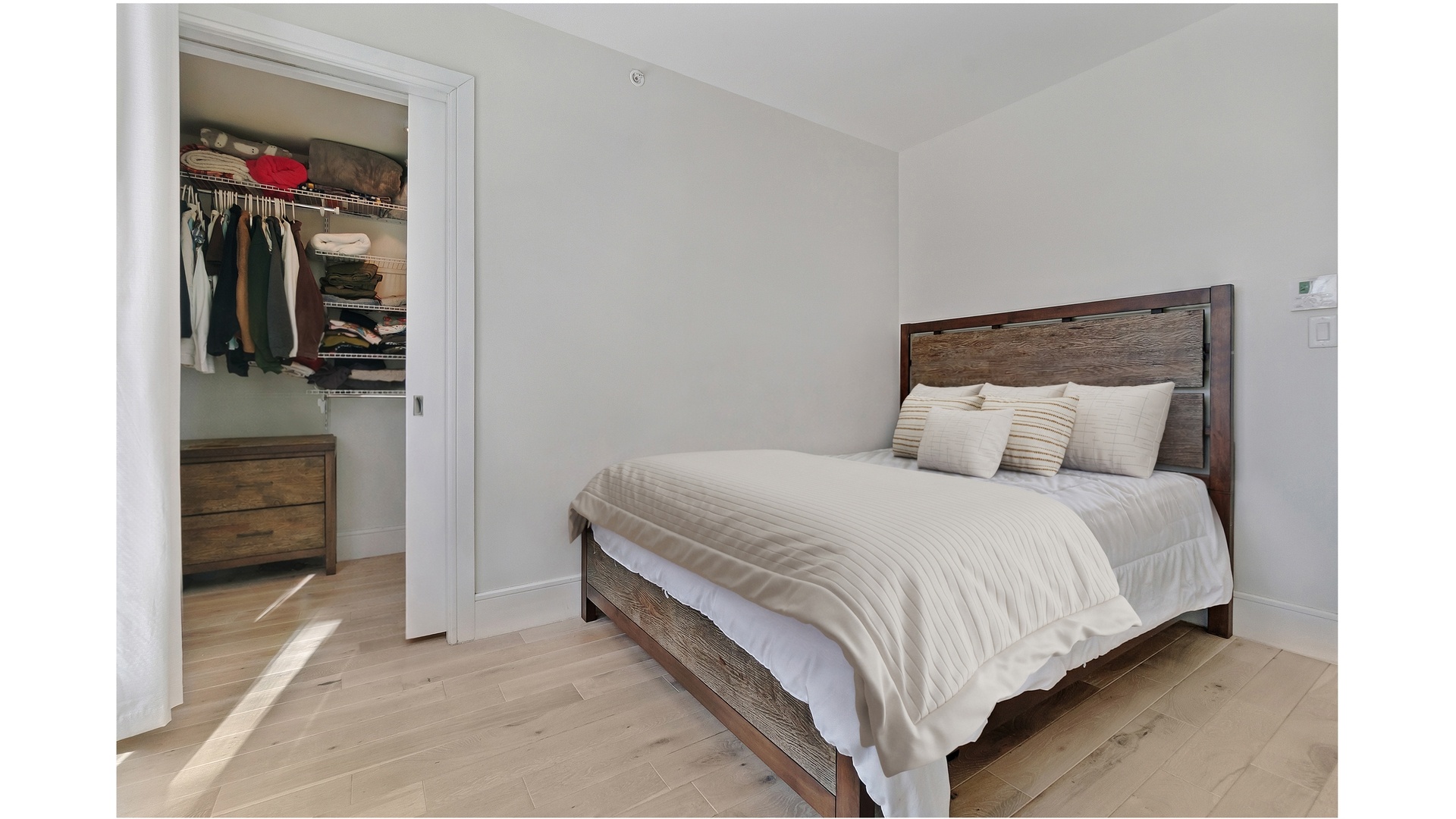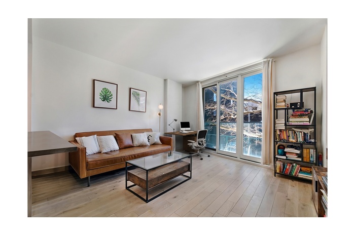 Residence #2B is an oversized, west-facing one-bedroom home filled with beautiful natural light and open sky views. The expansive layout is framed by floor-to-ceiling double-pane windows, creating a bright and airy living space. Wide 5-inch matte-finished oak plank floors and refined contemporary finishes throughout offer a clean, modern aesthetic, while the quiet exposure ensures a peaceful retreat.