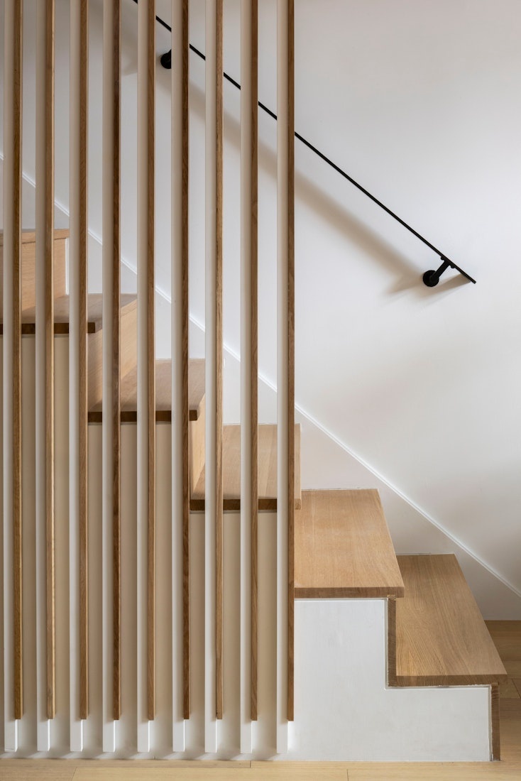 A custom white oak slatted staircase leads to the upper bedroom level, where the primary suite offers a tranquil retreat. Dual walk-in closets, a separate linen closet, and a luxurious en-suite bath featuring Italian Daino Reale marble, a custom dual oak vanity with brass accents, and a wet room with a floor-to-ceiling glass-enclosed shower and oversized marble-framed soaking tub define the space. Secondary bedrooms are bathed in natural light and feature generous closets, with access to a full bath appointed with a walnut vanity, Tundra Gray marble countertop, and porcelain tile finishes.