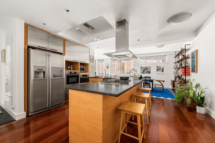 Ten-foot ceilings and a gracious foyer create a memorable arrival, while wide-plank wood floors carry throughout. The home unfolds seamlessly past the chef's kitchen into generous dining and living areas, all opening onto the larger terrace for effortless indoor-outdoor living.