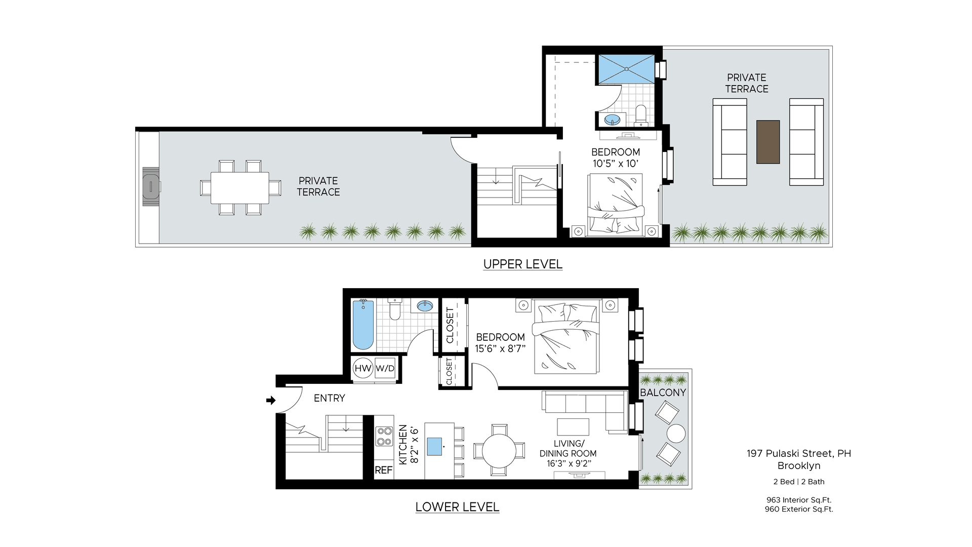 The Penthouse is a stunning two-bedroom, two-bathroom duplex penthouse featuring multiple private outdoor spaces with northern & southern exposures, including two expansive roof decks and an additional private balcony off the living area for elevated indoor-outdoor living.