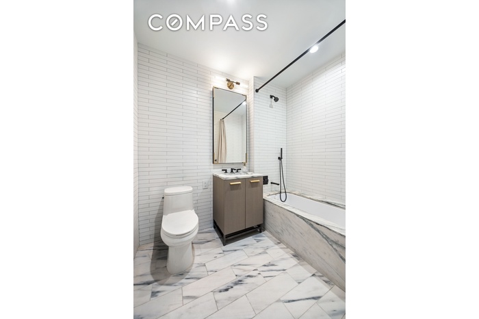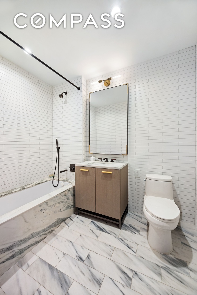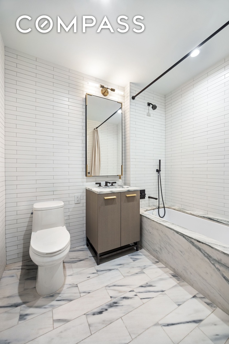 The primary bedroom includes a custom floor-to-ceiling wood built-in for additional storage. The en-suite bath is finished with Bardiglio marble floors, Poliform oak vanities and medicine cabinets with brass and pewter detailing, and Watermark plumbing fixtures. The shower has been extended to increase usable space and improve layout efficiency.