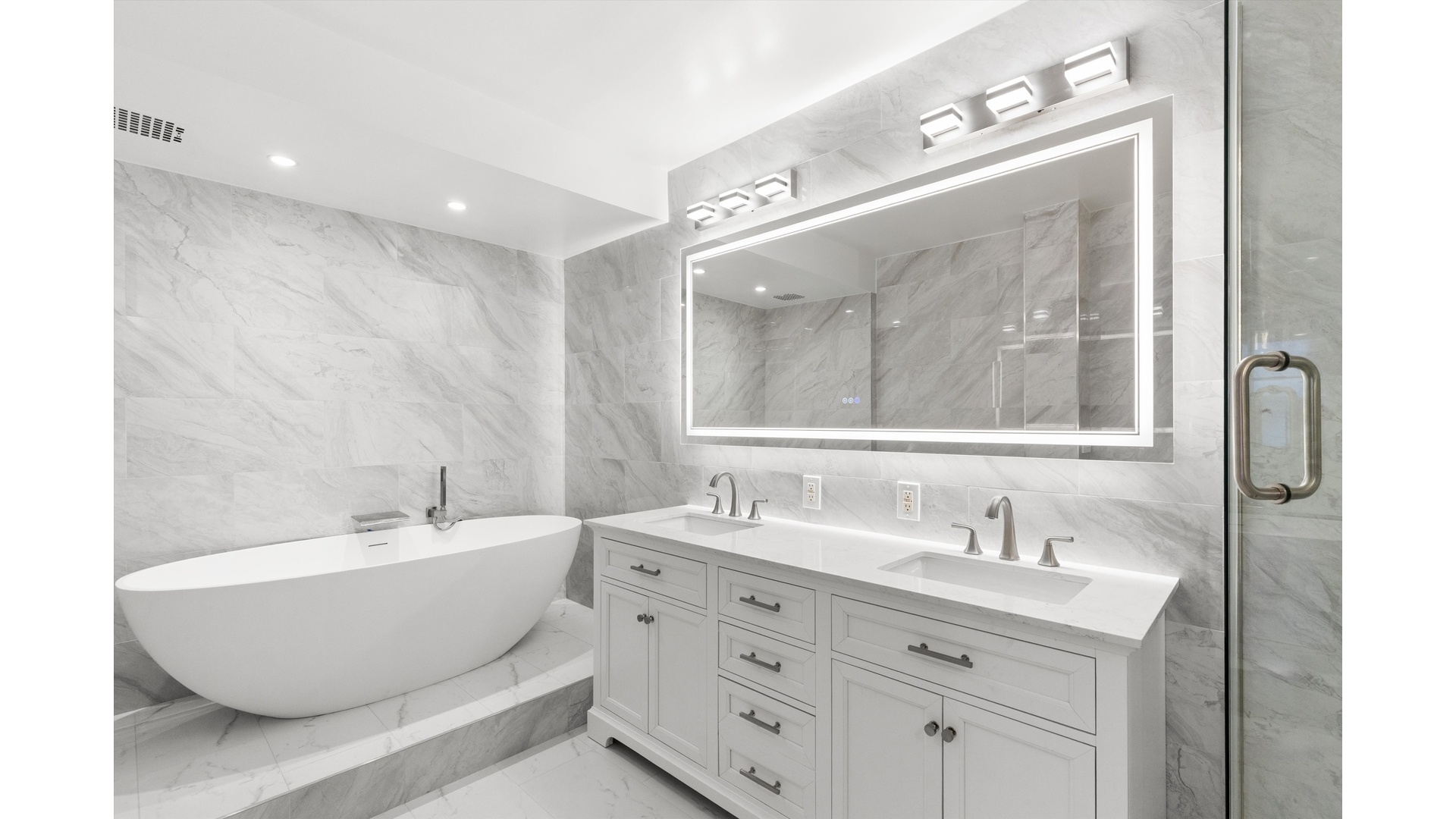 The primary suite serves as an immense retreat, boasting twin California-style walk-in closets and a brand-new, top-to-bottom renovated bathroom rivaling the quality of modern new construction, featuring a double sink & vanity with engineered Marble counter tops, a frameless glass shower, rain shower head, and a stand-alone soaking tub.