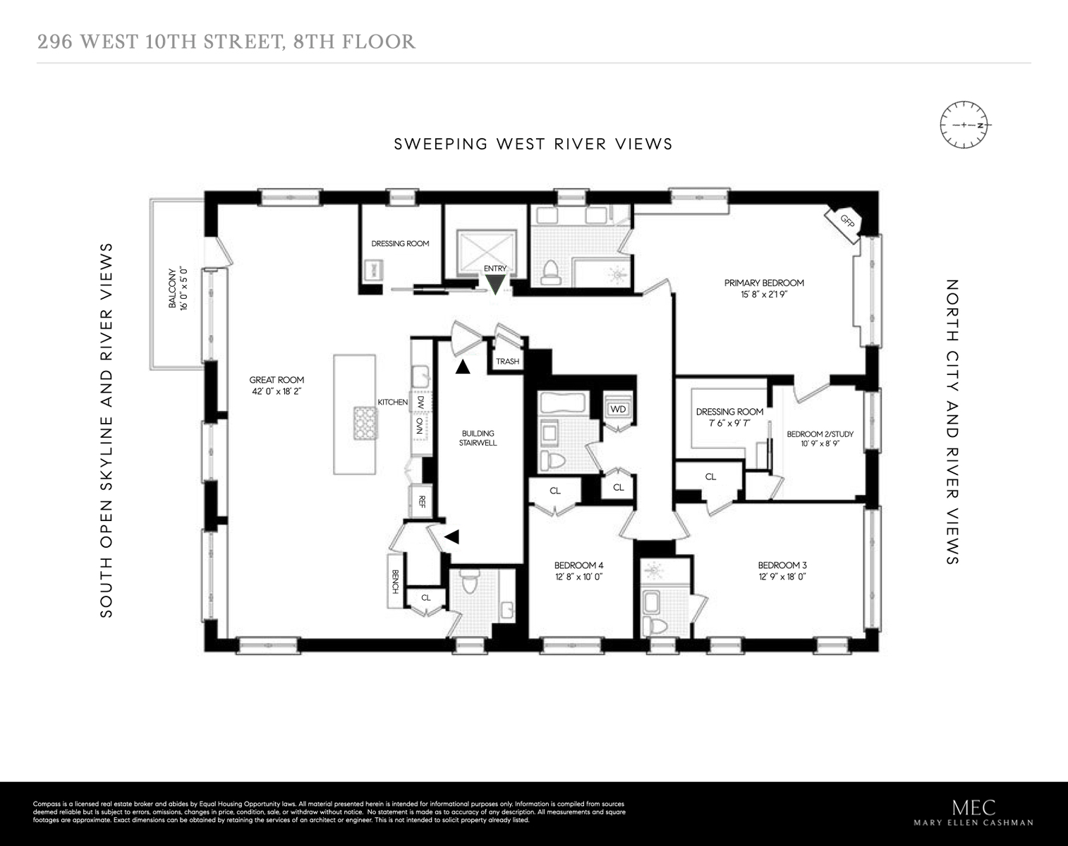Introducing the 8th floor at 296 West 10th, a sun-drenched, full-floor condo, where four exposures and a panoramic Hudson River view offer a rare vantage point over Manhattan. A key-locked elevator opens to a private foyer that divides the home into two distinct wings: a sprawling southern entertaining suite with a chef's kitchen and media room, and a serene northern wing with four generous bedrooms, including a primary suite with a gas fireplace, custom built-ins, and an ensuite bathroom overlooking the Hudson. Situated on a premier tree-lined block, the River West Condominium is a boutique 24-unit building that features a live-in superintendent, a butterfly system, and immediate access to the Hudson River Park, the Whitney Museum, and the Meatpacking District.