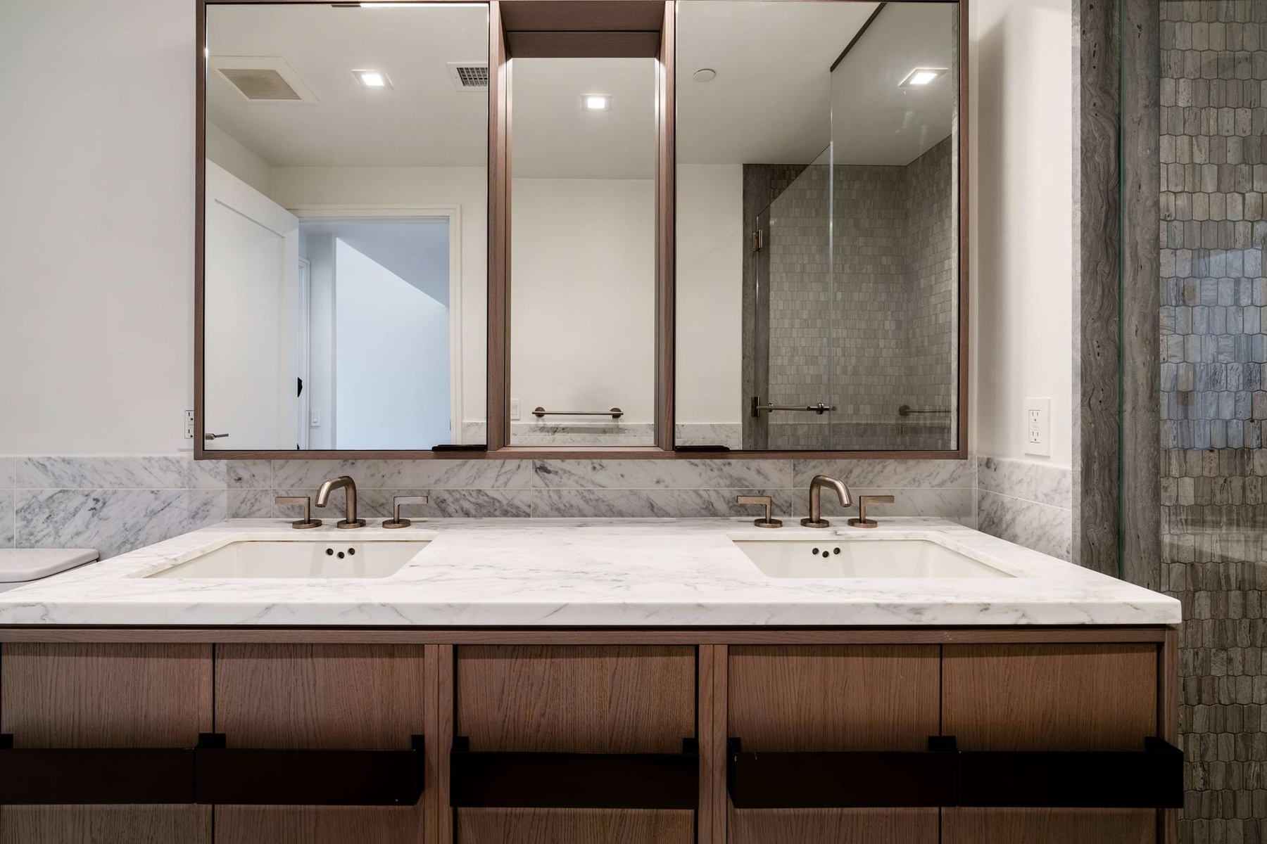 The custom kitchen is a showpiece—an entertainer’s dream and a chef’s delight. A sculptural Calacatta Regina marble island anchors the space, complemented by matching stone surfaces, bespoke grey lacquer cabinetry, and oil-rubbed bronze detailing. Fully integrated Miele appliances and soft LED lighting complete a kitchen that feels as luxurious as it is functional.