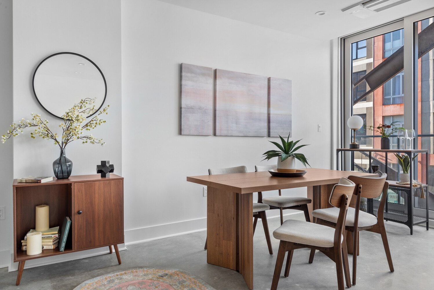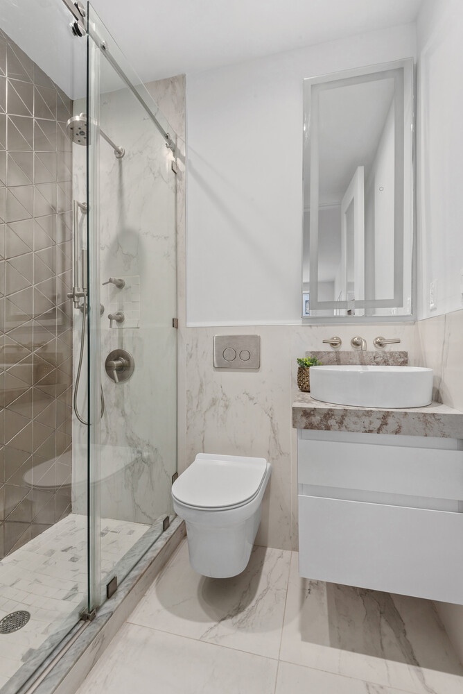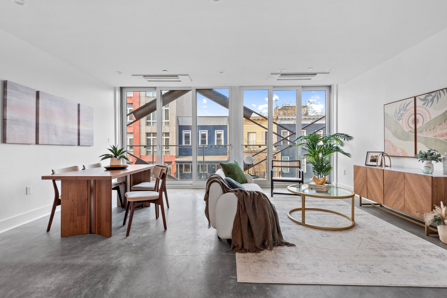 Step into a sun-drenched living and dining area featuring an impressive wall of windows that slide open to the Brooklyn breeze and your juliet balcony, flooding the room with natural light. The open layout provides plenty of space for both entertaining and relaxation. It is currently configured as a 3-bed with a wall in the living area to create the third bedroom, but the sponsor will remove this at the buyer's request.