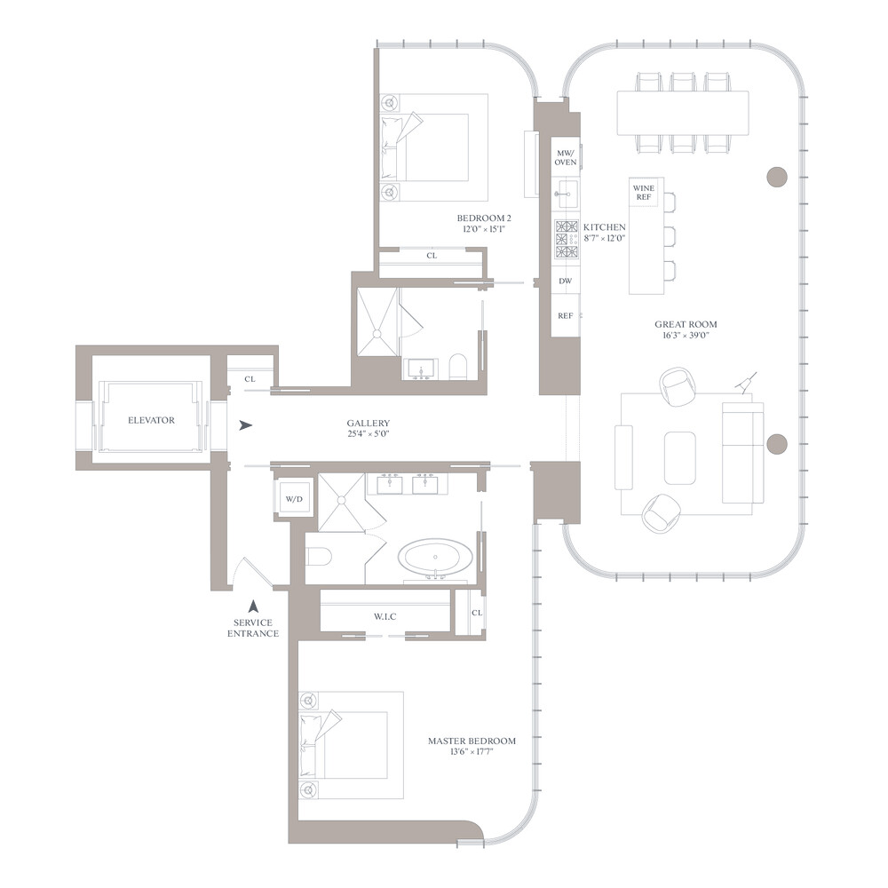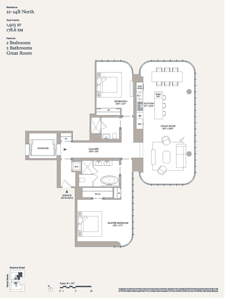 This gracious 1,923 SF, 2 bedroom, 2 bathroom residences with 10' ceilings and 6 inch wide-plank white oak floors throughout, features expansive north and east-facing views of the Manhattan skyline. A formal entry foyer leads to a breathtaking corner great room and open kitchen ideal for both entertaining and daily living. Floor-to-ceiling glass wraps this expansive 16'3 inch x 39' space allowing for abundant natural light and spectacular north and east-facing vistas through the curved facade.