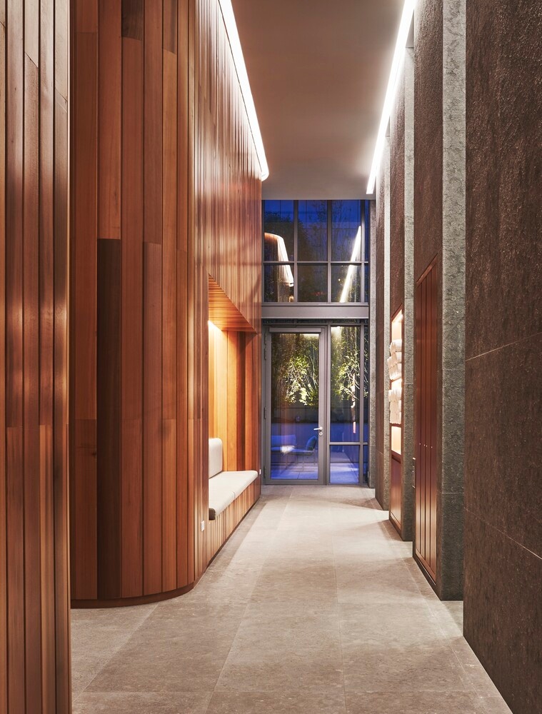 The kitchen offers a rich mix of materials and textures with custom designed solid fluted white oak cabinets, center island breakfast bar, Balsatina lavastone countertops, and Zucchetti fixtures. Fully integrated, state-of-the-art Miele appliances include a four-burner gas cooktop with built in fully vented hood, 24 inch microwave/ speed oven, refrigerator, freezer, dishwasher, and wine cooler.